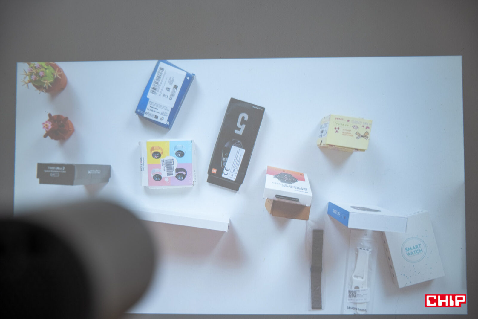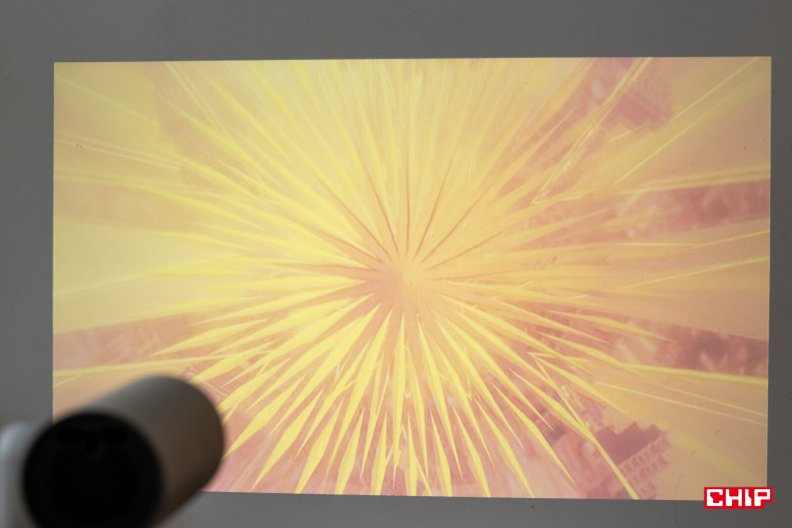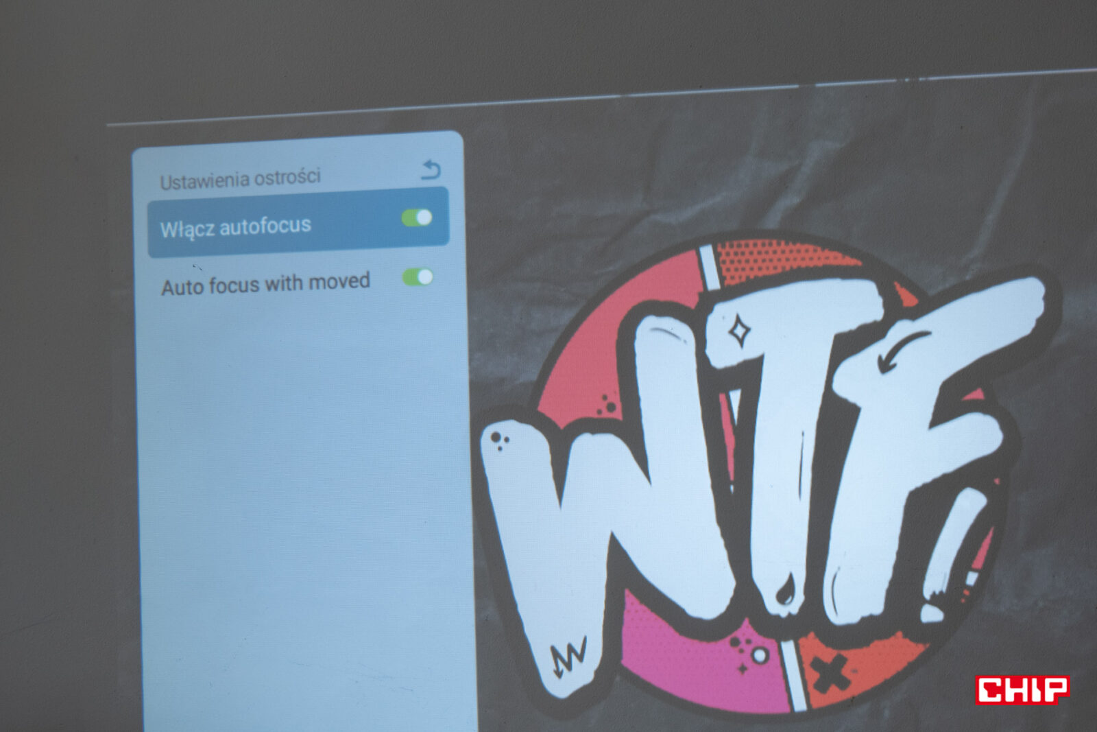 Bardzo dobrze spisuje się tu korekcja trapezowa wyświetlanych treści. Rozwiązanie niemal błyskawicznie reaguje, czy to na przesunięcie projektora, czy też zmianę kąta. Miałem wrażenie, że gdy testowałem Asusa ZenBeam L2, to zmiany zachodziły szybko, jednak tutaj dzieje się to ekspresowo. Szkoda tylko, że automatyczna regulacja ostrości wyświetla nam biały ekran z symbolami – to dość mocno daje się we znaki, gdy projektor jest jedynym źródłem światła. Oprogramowanie ma zatem dobre podstawy i liczę, że w przyszłości poprawki doprowadzą je do perfekcji.