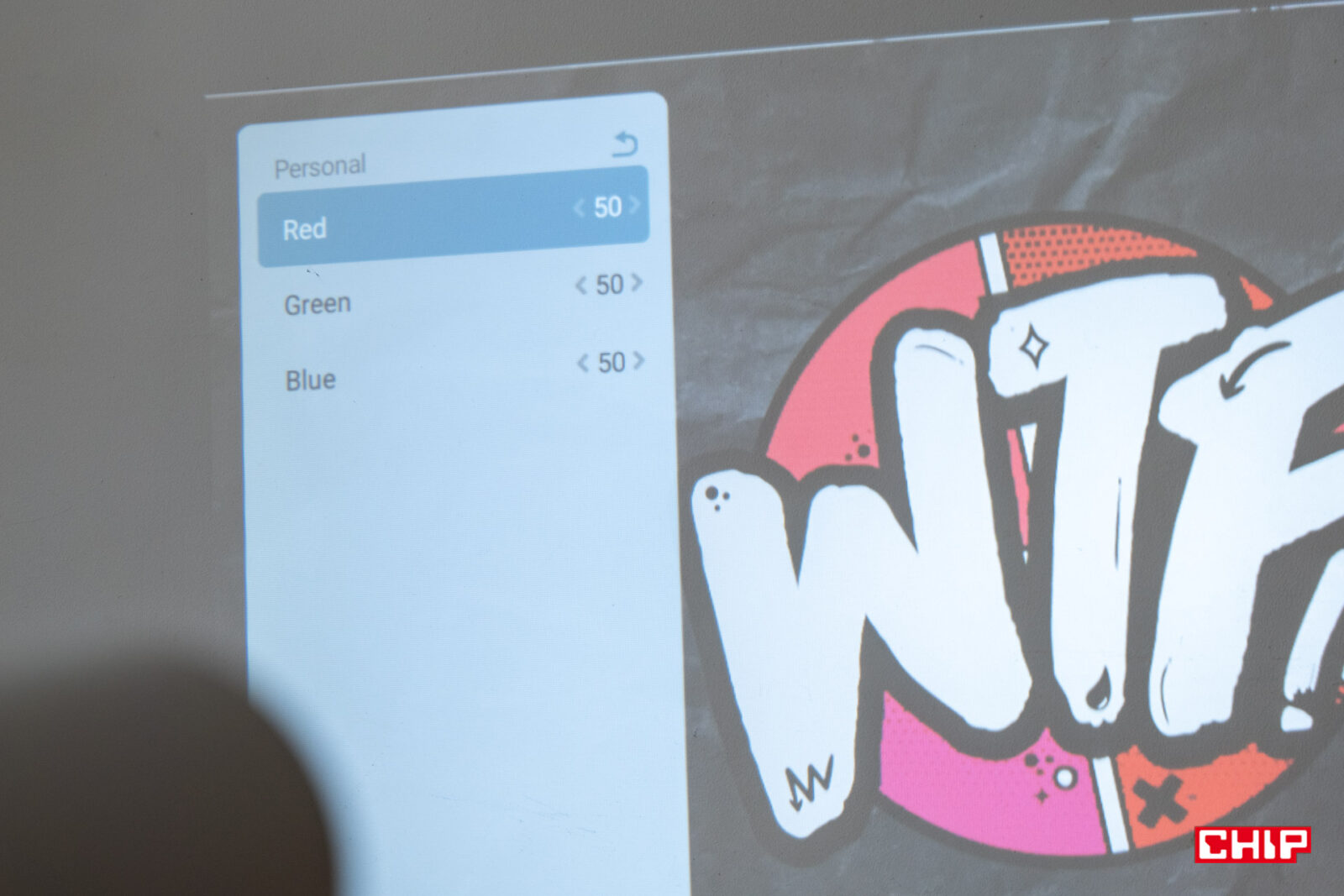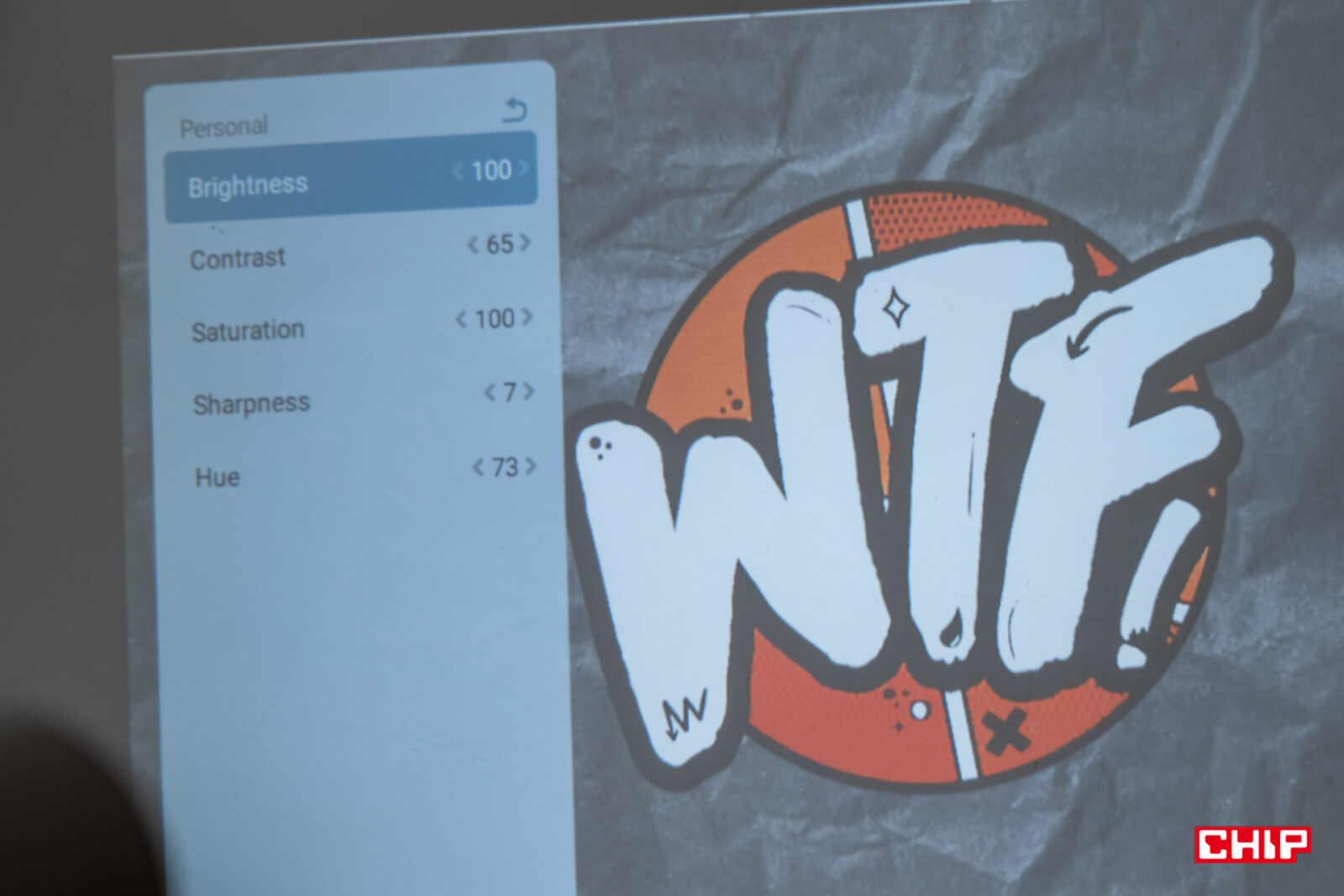 Projektor, choć na papierze nie imponuje, jest dość jasny. Nie na tyle, by w słoneczny dzień bez zasłon komfortowo oglądać filmy, ale gdy już z częściowo przyciemniających zasłon skorzystamy lub oglądamy nocą, to z pewnością będziecie zmniejszać jasność domyślnie ustawioną w połowie swojej mocy. Niestety wyższe poziomy wpływają na kontrast i obniżenie nasycenia barw, ale domyślna jasność w zupełności wystarcza na co dzień.