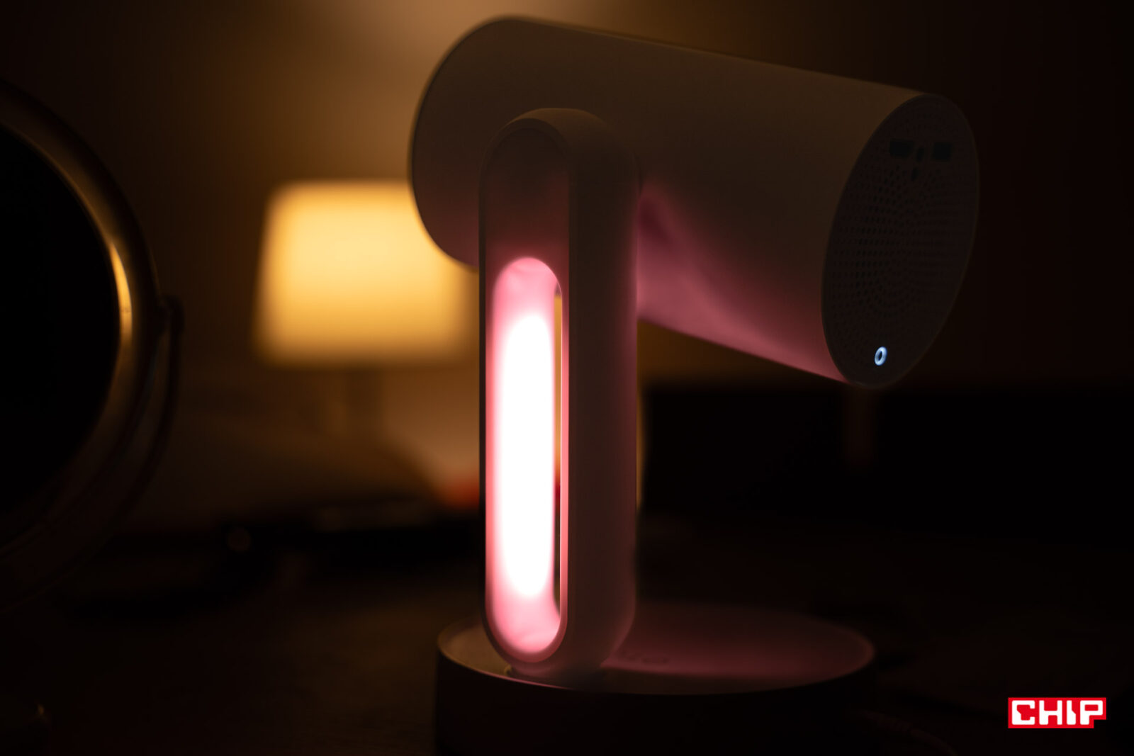Wrażenie solidności utrwalają dalsze elementy. Projektor ma swobodę ruchów nawet po podpięciu kabli, a to wszystko jest zasługą sporego odstępu między nim, a podstawą. Ten efekt udało się osiągnąć dzięki kilkunastocentymetrowemu łącznikowi, na górnej ścianie którego znajdziemy wgłębienie (to przycisk do włączenia podświetlenia lampki. To miło wyglądający dla oka element z podświetleniem w kilku kolorach. Stanowi on jeden element z dociążoną podstawą, może więc bezproblemowo służyć do podnoszenia całości.