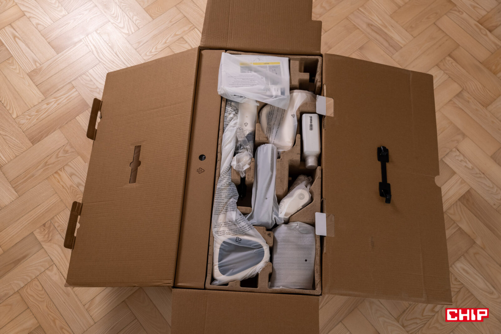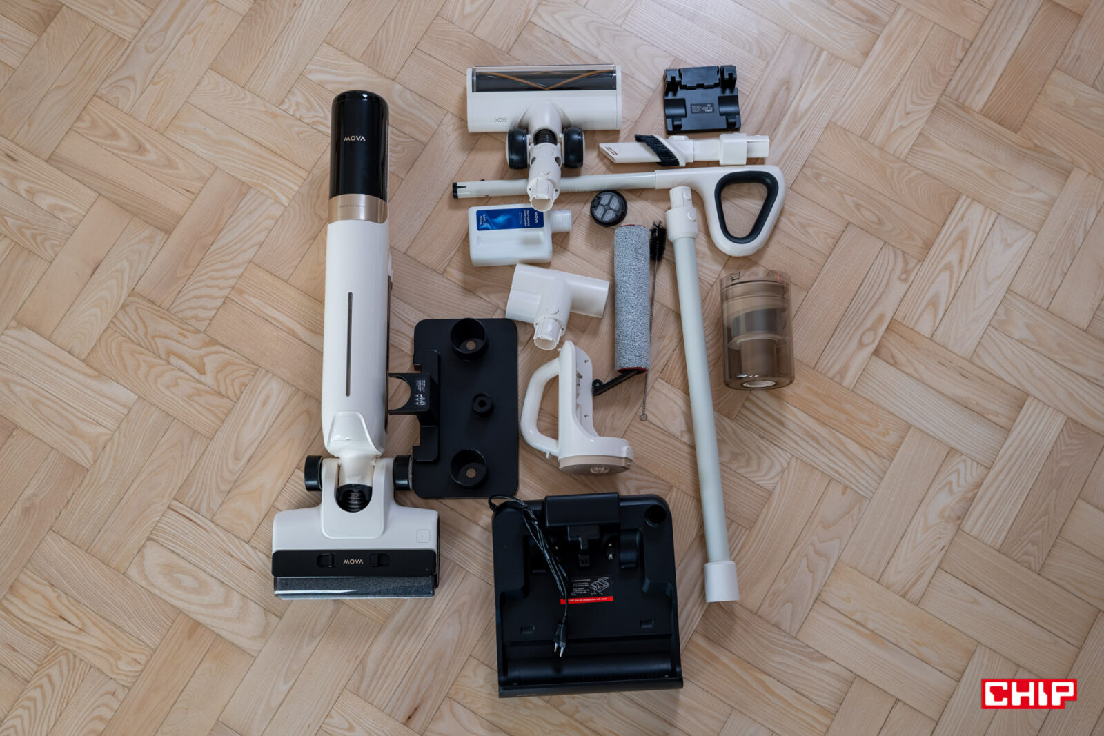 Ze względu na de facto dwa urządzenia w jednym opakowaniu, liczba elementów jest spora. Do złożenia odkurzacza potrzebujemy modułu ze szczotką, rury, pojemnika na brud i kosza mieszczącego odczepiane ogniwo. Do mopa niezbędne są – poza dedykowaną końcówką z wałkiem – pojemnik na brud i wodę, ogniwo oraz doczepiana rękojeść wydłużająca konstrukcję.
