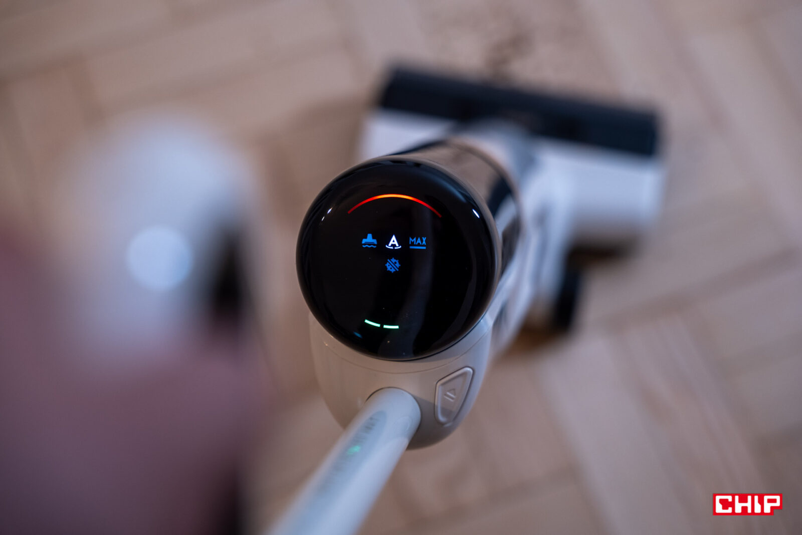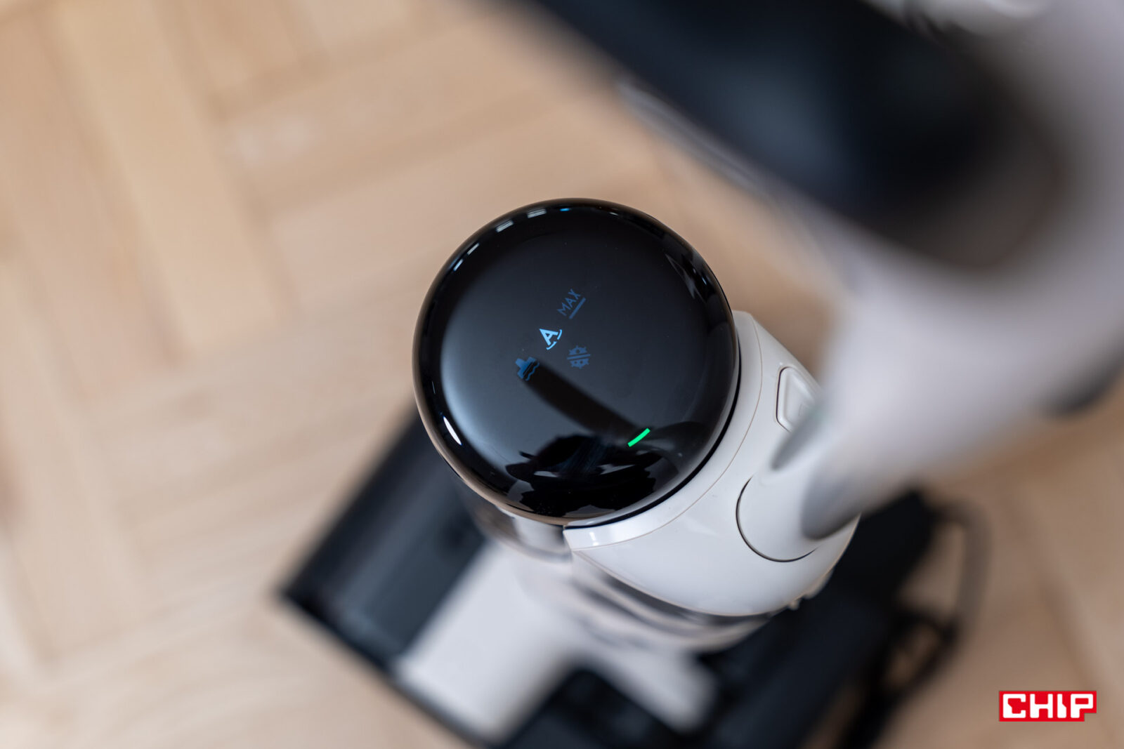 Procedurę czyszczenia zainicjujemy poprzez wciśnięcie odpowiedniego przycisku na rękojeści mopa. Co ważne, czyszczenia nie przeprowadzimy bez włożonej baterii. Szkoda, bo mogłoby to przyspieszyć proces sprzątania po przełożeniu akumulatora do odkurzacza. Po kilku chwilach mycia z wykorzystaniem wody otrzymujemy komunikat informujący o procesie suszenia szczotki rolkowej. Proces trwa około 30 minut i jest odczuwalnie głośny. Nie na tyle, by nie przebywać w tym samym pokoju, ale by z odległości około trzech metrów wprowadzać szum na poziomie 55 dB.