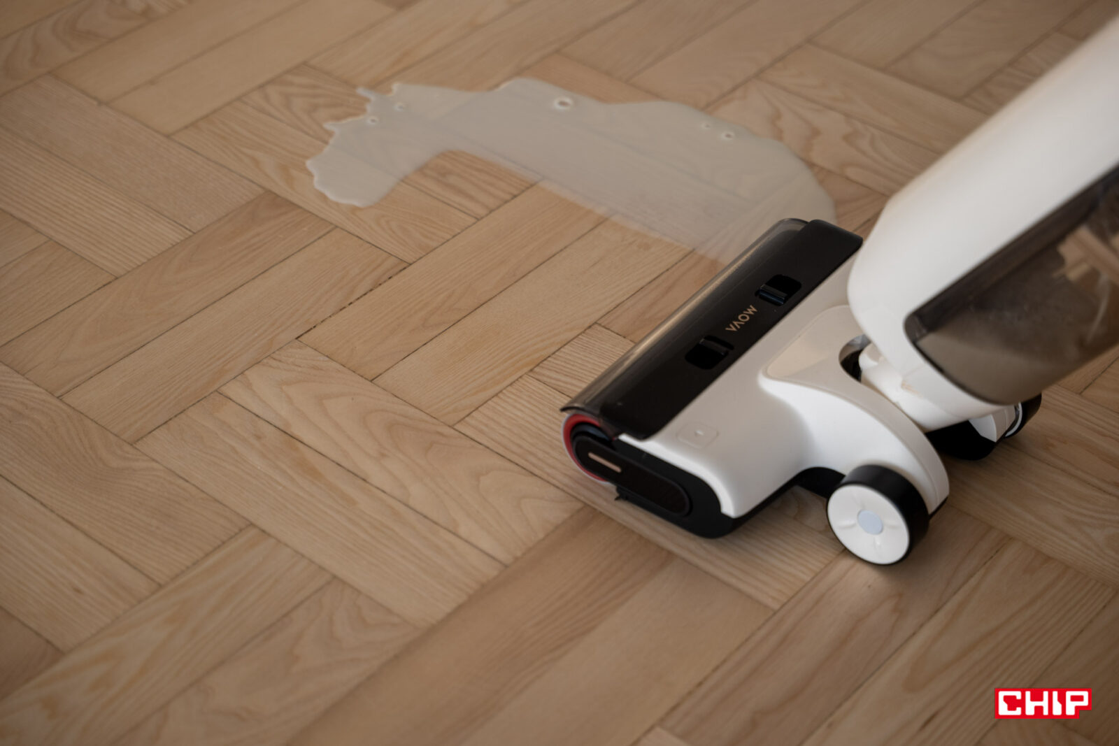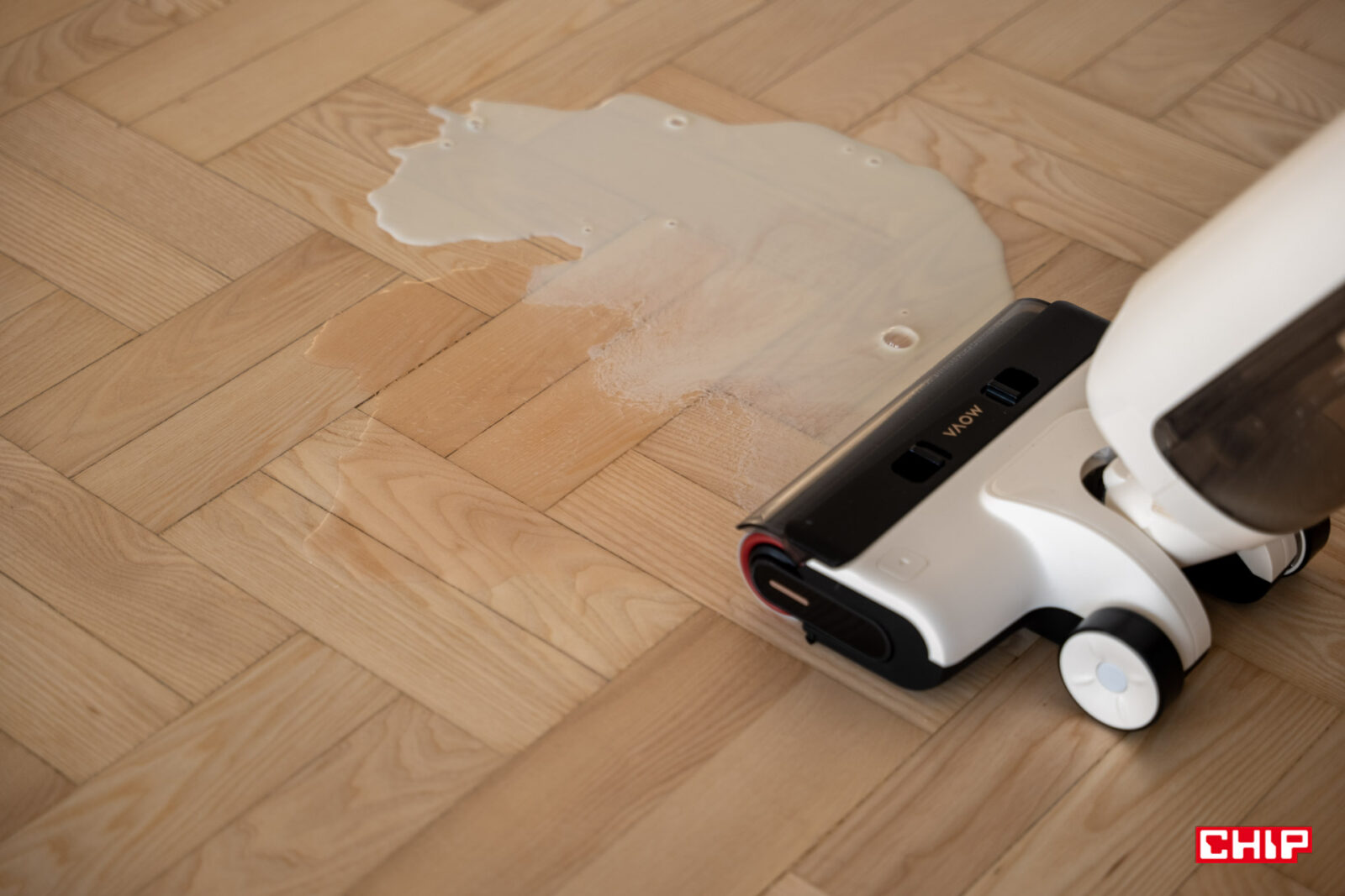 Zacznę od sprzątania i tu nie mogę zrobić nic innego, jak pochwalić. Mova K30 Mix zmyje z podłogi każdy brud – gęsty sos, sok, napój czy mleko nie przylepiły się do podłogi ani do szczotki. Całość wchłania płyn niczym gąbka i po jednym przejeździe nie ma po nim śladu. Więcej przejazdów potrzeba dla kleistych plam, ale najczęściej dłuższa chwila na plamie w zupełności wystarczy. Jednocześnie nie miałem poczucia, że mop ciągnie mnie za rękę czy próbuje samodzielnie pojechać. Do tego całość dobrze wchłania mniejsze i większe kawałki brudu, jak chipsy, okruchy ciastek i kawałki czekolady.