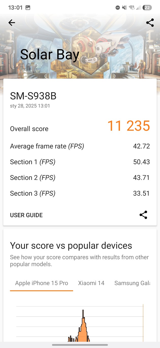 Gdy telefon się mocno nagrzeje, czy to przez gry, czy przez 5G, procenty spadają dość szybko, nawet w 4 godziny. Jednocześnie zwykły śmiertelnik, korzystający z telefonu bez potrzeby dostarczania sobie wielu godzin pustej rozrywki, bez problemu pokorzysta z telefonu przez 8 godzin i jest to czas bardzo dobry, a do tego osiągnięty bez większego akumulatora. Konkurencja potrafiła odskoczyć (na przykład realme GT7 Pro), ale ma to mniejsze znaczenie, gdy ktoś ma swój ekosystem z aplikacjami i innymi urządzeniami, które nie zadziałają najlepiej poza nim.