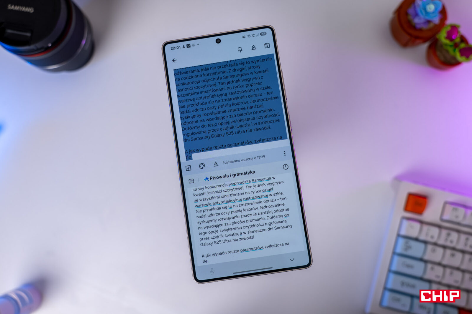 Ten jednak wygrywa z wszystkimi smartfonami na rynku poprzez warstwę antyrefleksyjną zastosowaną w szkle. Nie przekłada się na zmatowienie obrazu – ten nadal uderza oczy pełnią kolorów. Jednocześnie zyskujemy rozwiązanie znacznie bardziej odporne na wpadające zza pleców promienie. Dołóżmy do tego opcję zwiększenia czytelności regulowaną przez czujnik światła i w słoneczne dni Samsung Galaxy S25 Ultra nie zawodzi.