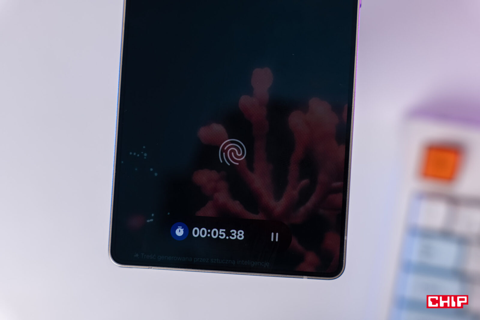 A co z biometrią? Trochę rozczarowała mnie praca ultradźwiękowego skanera linii papilarnych. Ten potrafi być szybki, choć nie tak szybki, jak to, co oferuje konkurencja. W dodatku nie rozpoznaje za dobrze kciuka pod wieloma kątami. W wielu sytuacjach szybsze będzie odblokowanie telefonu twarzą. To, z natury przedniego aparatu, jest mniej bezpieczne, ale nie zadziała zdjęcie czy twarz wyświetlona na innym telefonie.