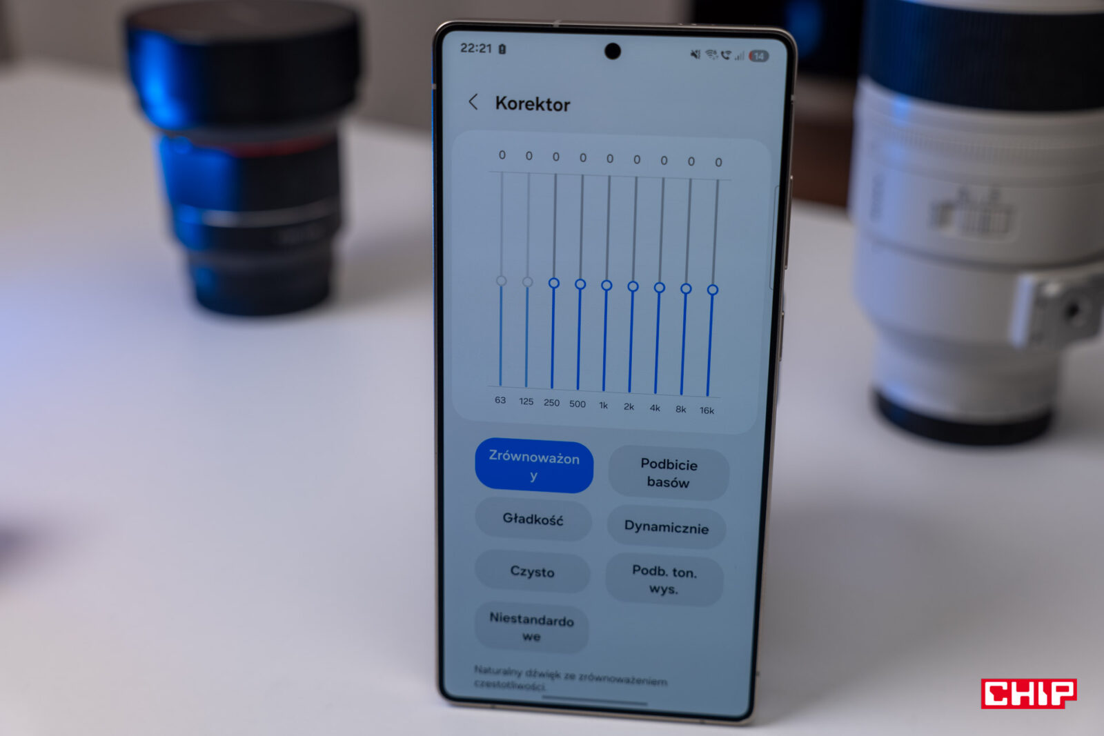 W kwestii dźwięku nie znajdziemy nic, czego nie byłoby we flagowcach Samsunga z ostatnich kilku lat. Możemy skorzystać z opcji korekcji dźwięku Dolby Atmos, jak i z własnych ustawień korektora graficznego (z kilkoma sugestiami od producenta). Co istotne, zmian dokonamy tak w obrębie systemu, jak i konkretnych aplikacji, co może być przydatne. Dodatkowo istnieje tu funkcja Adapt Sound, dopasowująca odtwarzany dźwięk do specyfiki naszych uszu wynikającej między innymi z wieku. W ten sposób preferowane ucho może dostać wyraźniejszy dźwięk. Poza tym z telefonu odtworzymy dźwięk na innym urządzeniu przy jednoczesnym niezależnym odtwarzaniu innego źródła na naszym telefonie.