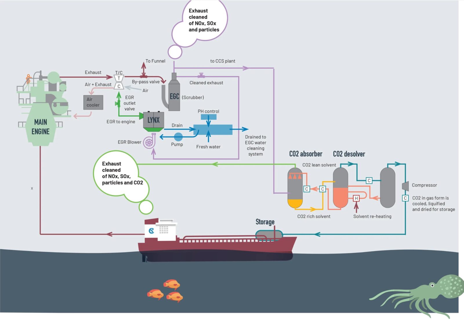 OCCS to specjalne systemy, które umożliwiają przechwytywanie emisji CO₂ bezpośrednio z gazów spalinowych statku w trakcie rejsu. Następnie ten dwutlenek węgla jest przetwarzany i magazynowany na pokładzie, aż do momentu jego rozładunku w przeznaczonych do tego portach. Jednym z pierwszych statków wyposażonych w pełnowymiarowy system tego typu jest Clipper Eris, który należy do norweskiej firmy żeglugowej Solvang, która wspólnie z partnerami, takimi jak Wärtsilä, MAN Energy Solutions i instytut badawczy SINTEF, przeprowadziła modernizację jednostki, instalując właśnie ten nowoczesny system redukcji emisji CO₂.