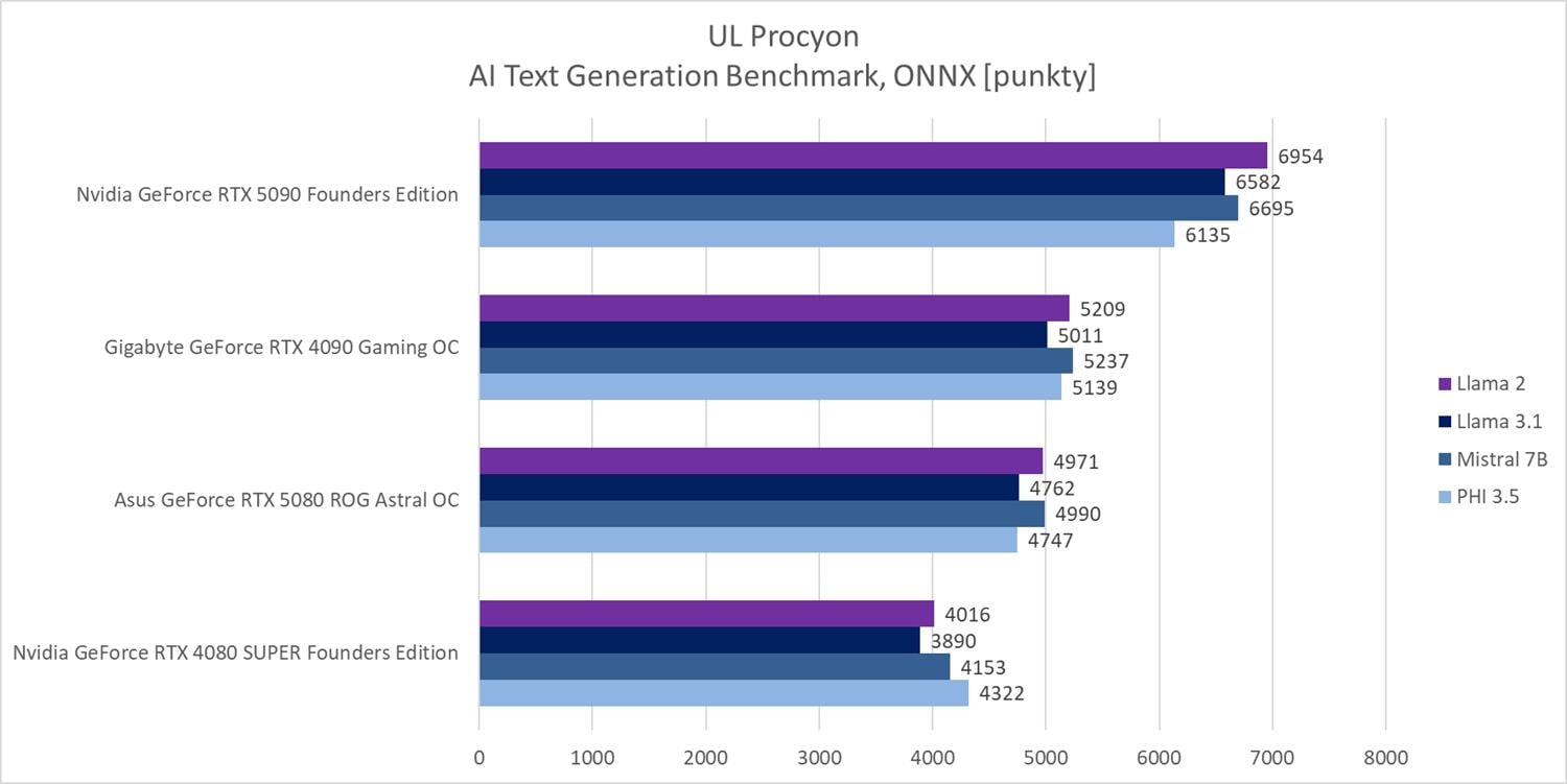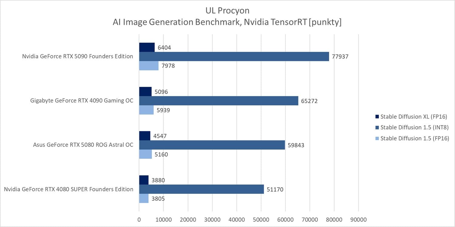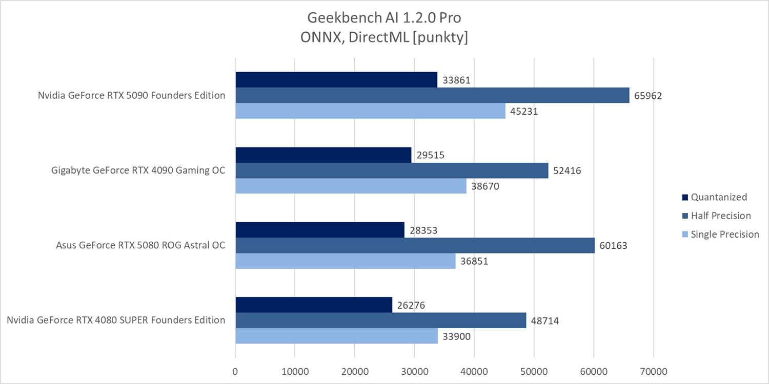 Geekbench AI powinien dobrze pokazać różnice w wydajności właśnie w takich zastosowaniach. RTX 4090 wyprzedza RTX 5080 w dwóch testach (o ok. 4% i 4,9%), z kolei w jednym (Half Precision) przegrywa o ok. 13%. RTX 5090 ponownie znajduje się na szczycie wykresu z przewagą od ok. 14,7% do ok. 25,8%.
