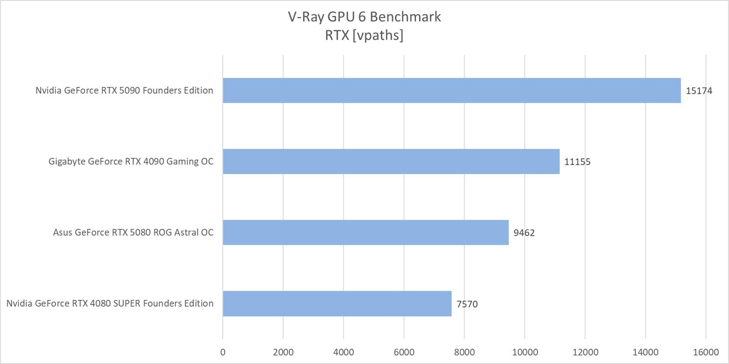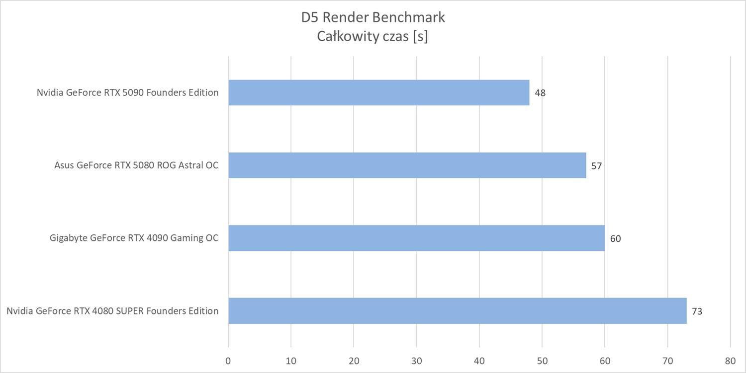 Na koniec pozostał V-Ray z testem RTX. Nowe modele wyprzedzają poprzedników o ok. 25% (5080 vs 4080 Super) i ok. 36% (5090 vs 4090).