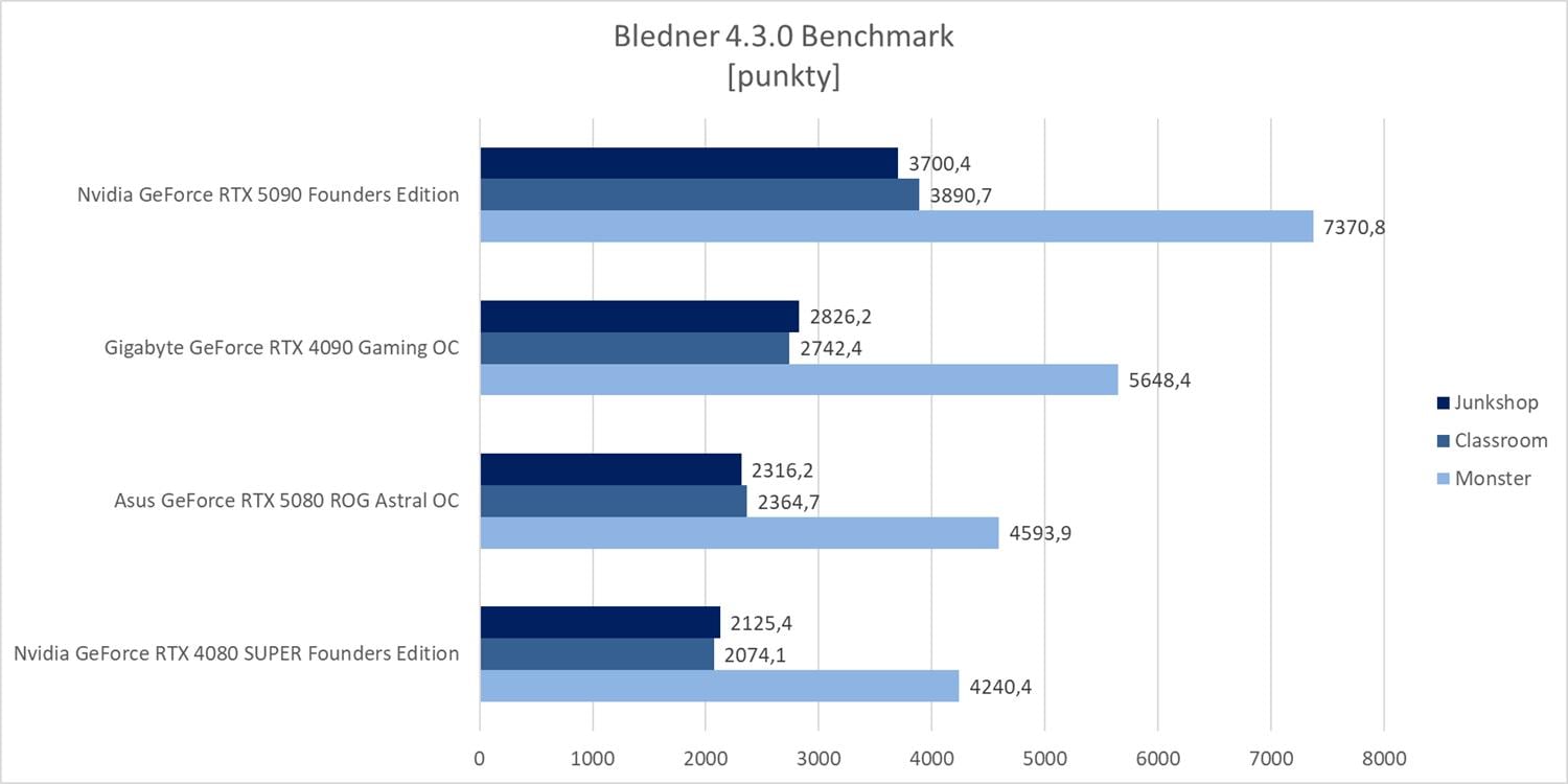 W Blenderze RTX 4090 wraca na miejsce pomiędzy RTX 5090 a RTX 5080. Przewaga RTX 5080 nad RTX 4080 SUPER wynosi od ok. 8,4% do ok. 14% w zależności od testu. Strata do RTX 4090 to od ok. 16% do ok. 23%. Z kolei RTX 5090 notuje bardzo ładną przewagę nad poprzednikiem wynoszącą od ok. 30,4% do ok. 41,9%.