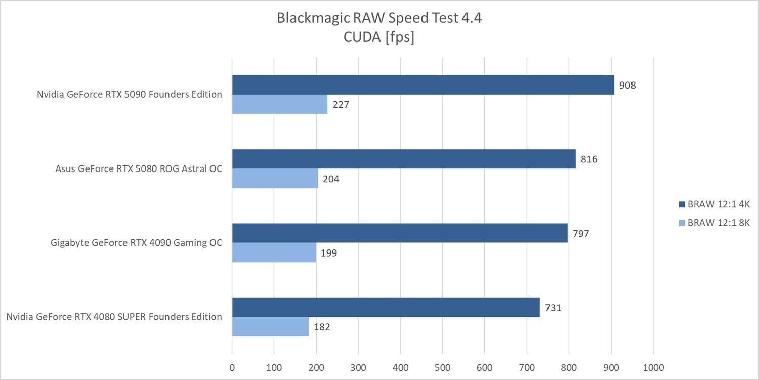 W kolejnym programie mamy ponownie przewagę RTX 5080 nad RTX 4090 wynoszącą ok. 2,5% w obu testach. Nad RTX 4080 SUPER wynosi ona ok. 11,6% i ok. 12,1%. RTX 5090 wygrywa z RTX 4090 o ok. 14%. Nowa generacja kart wypada więc ponownie lepiej od poprzedników.