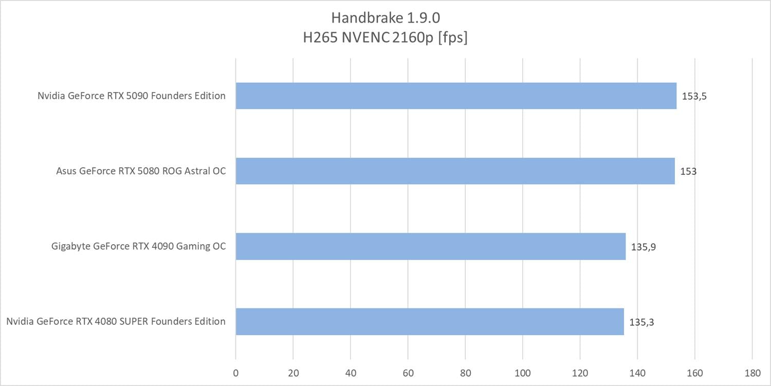 W Handbrake przy wykorzystanie enkodera NVENC widać różnice pomiędzy seriami kart. RTX 4000 wypadają o ok. 13% gorzej od swoich odpowiedników w nowej serii.