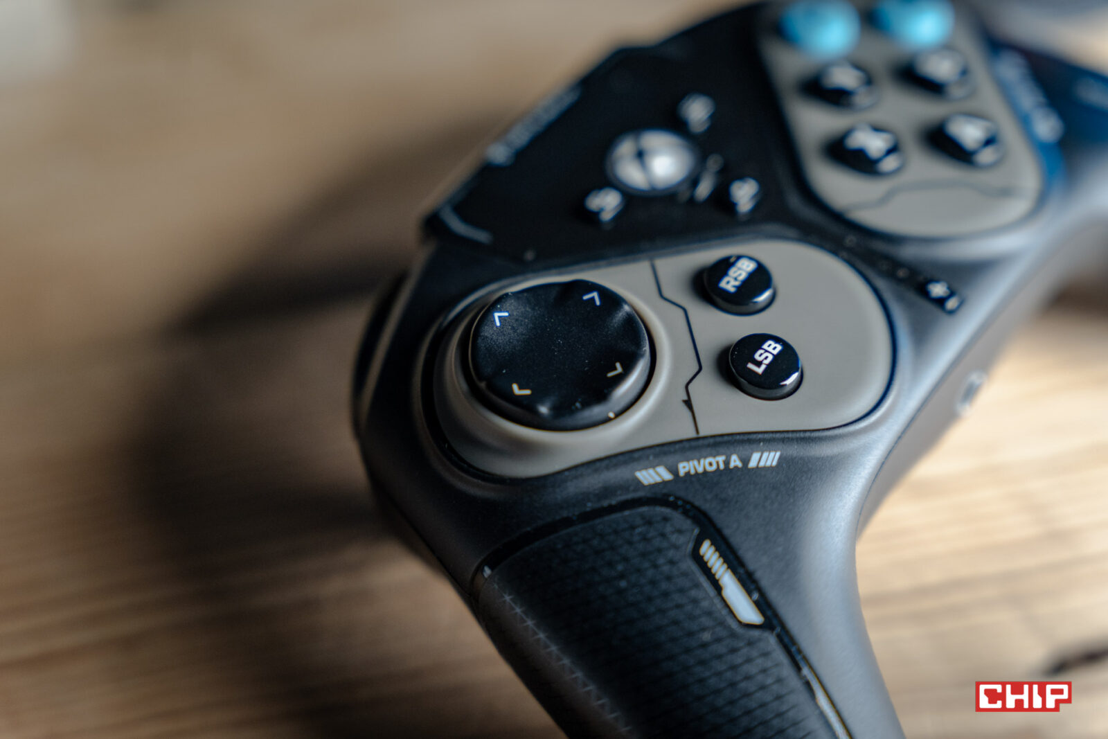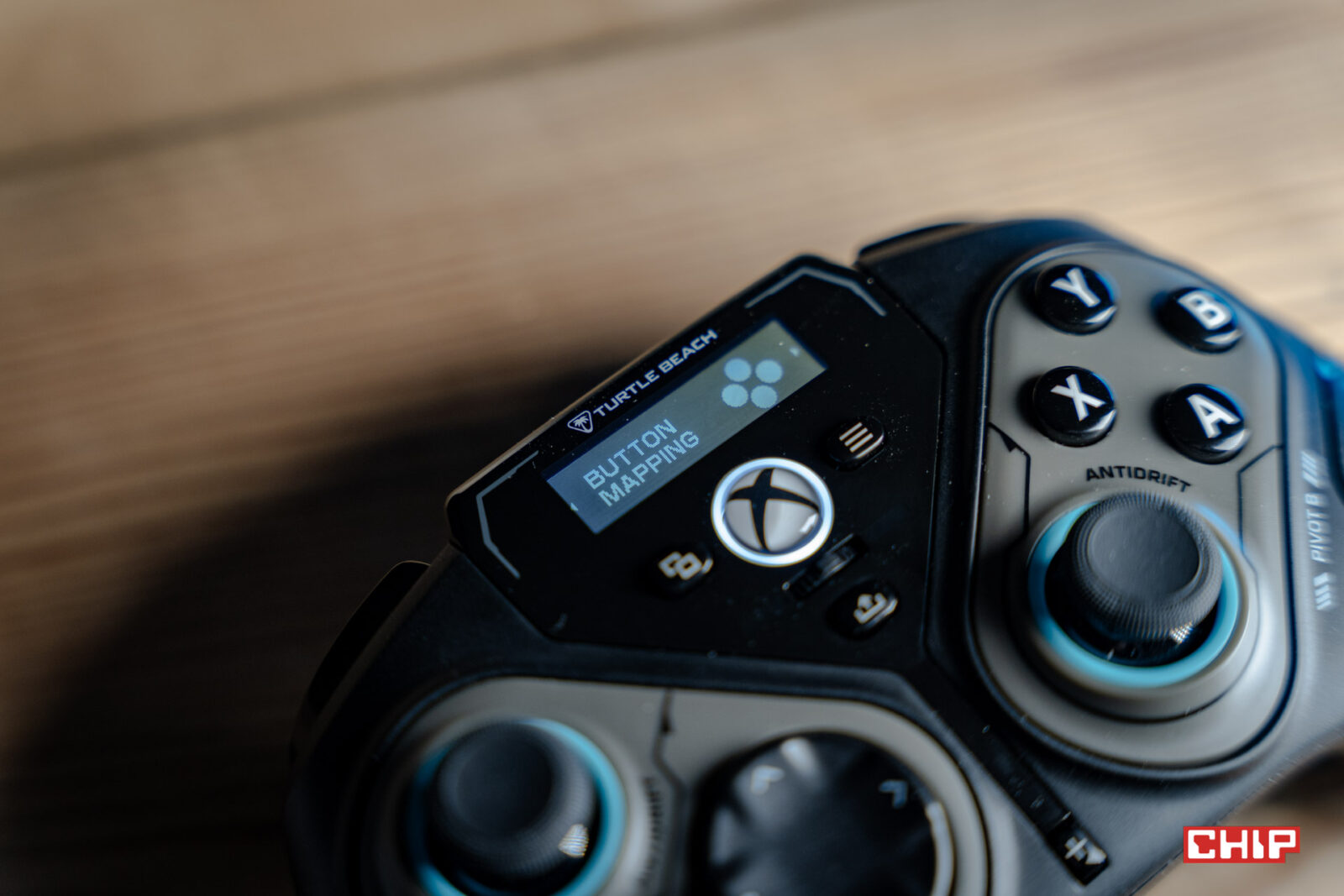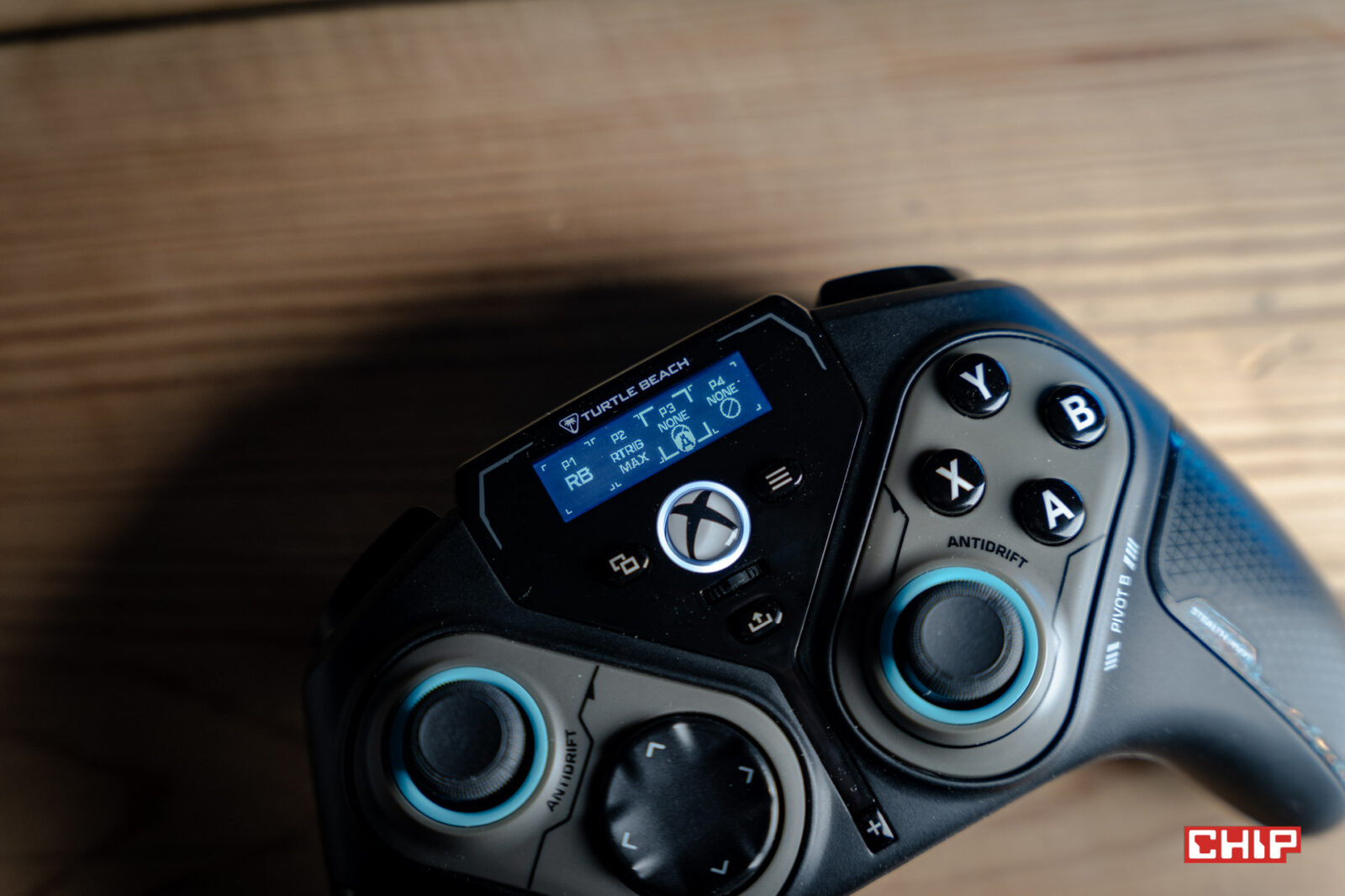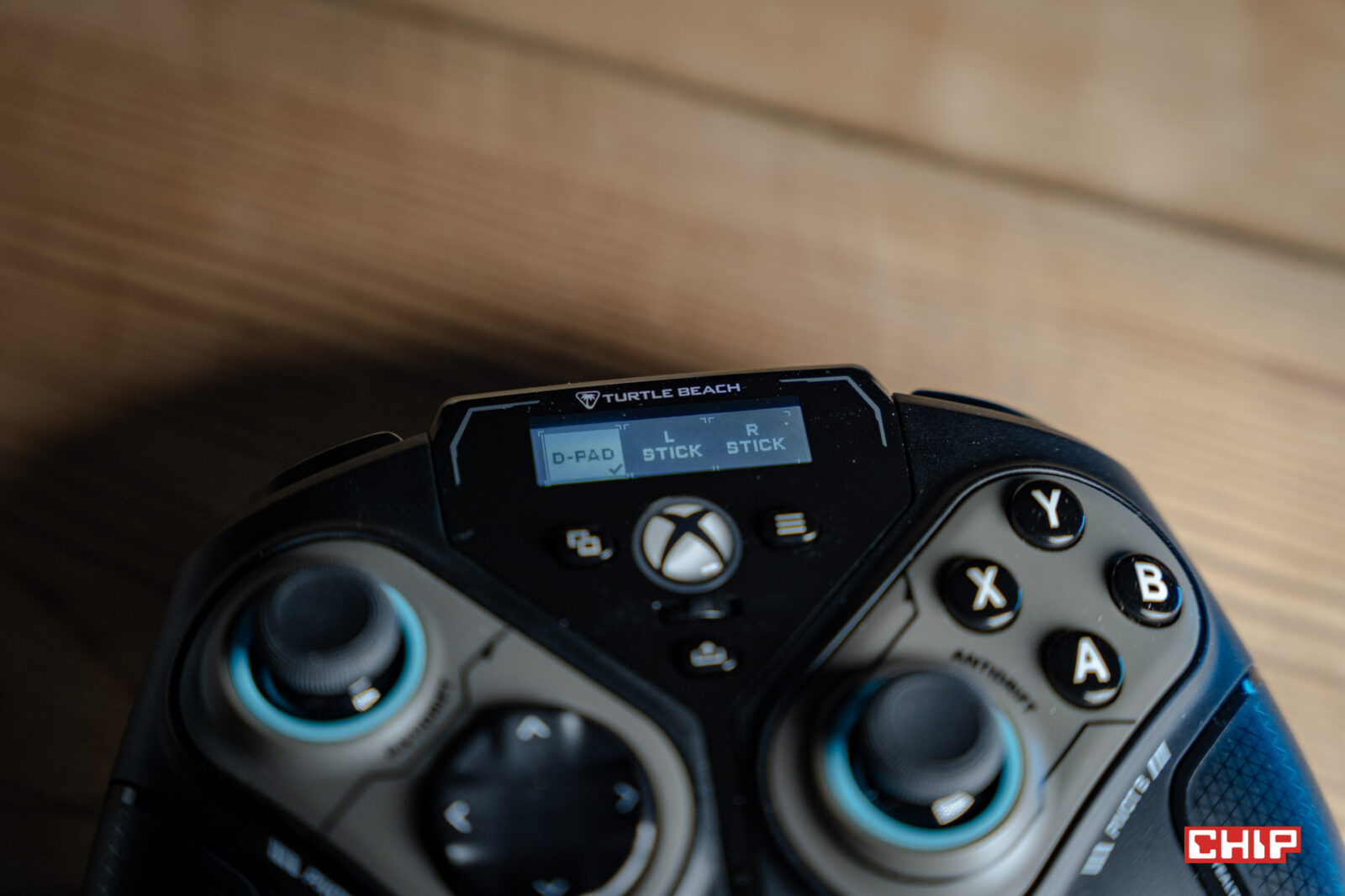 Na górze pada znajdziemy nieduży i prosty ekran, który pozwala na sterowanie niektórymi z dostępnych funkcji. Możemy tu przypisać skróty do przycisków na tyle obudowy lub P1 i P2 (dostępne po obróceniu prawej części kontrolera) i zapisać do pięciu ich wariantów w formie profili, pomiędzy którymi też przełączamy się na ekranie. Możemy też zmienić działanie d-padów oraz funkcję suwaka umieszczonego pod logo Xboxa. Suwak idealnie sprawdza się do regulacji głośności.
