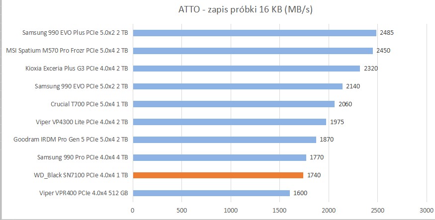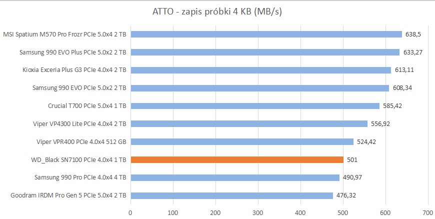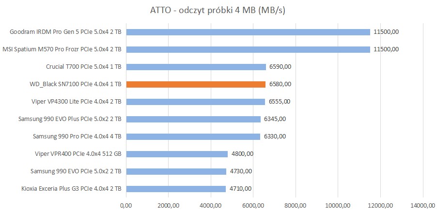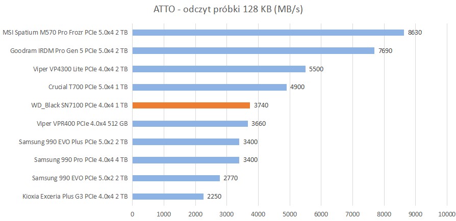 Syntetyczne testy pozwalają nam wstępnie ocenić możliwości danego dysku. Według pomiarów wykonanych w Crystal Disk Mark 8 oraz ATTO Disc Benchmark, dysk WD_Black SN7100 spisuje się interesująco w losowych operacjach odczytu i zapisu, ale w zestawie pomiarów ATTO wypada bardzo słabo. Czyżby to owoc zrezygnowania z tradycyjnego bufora?