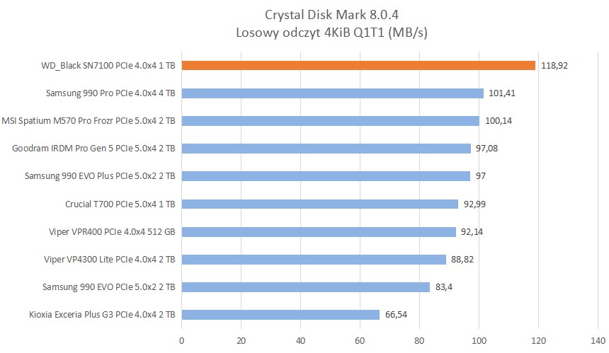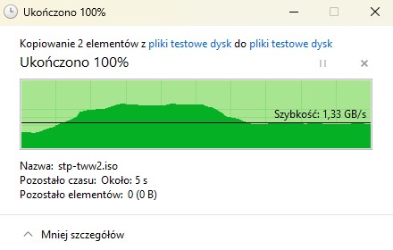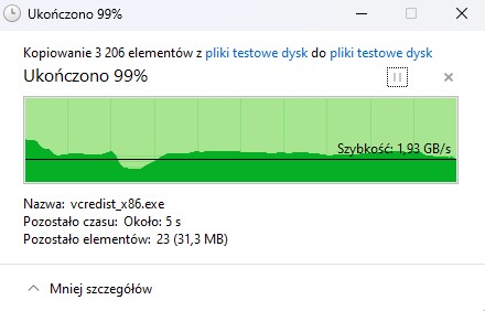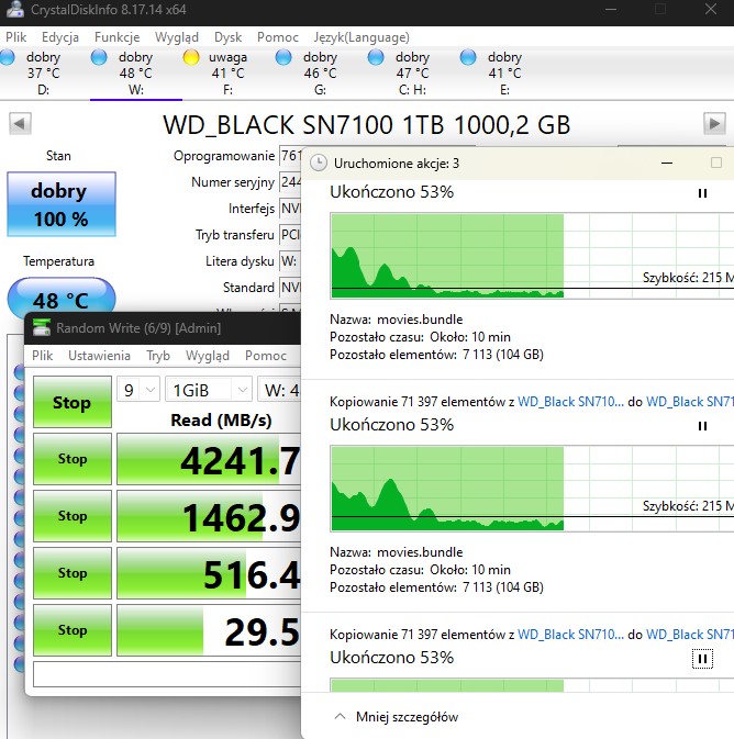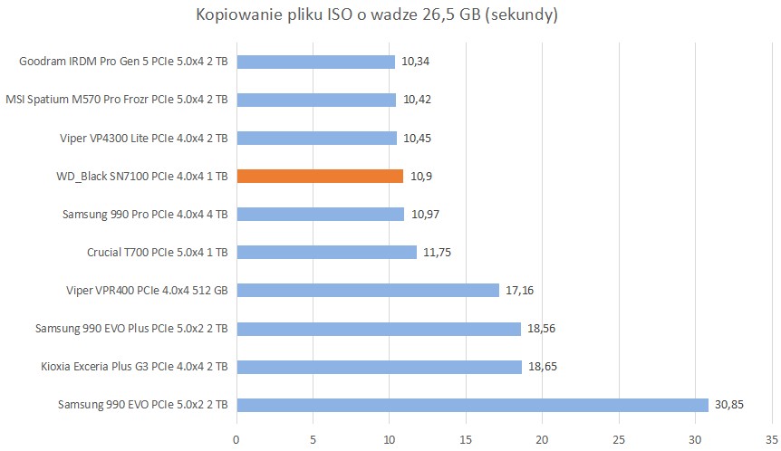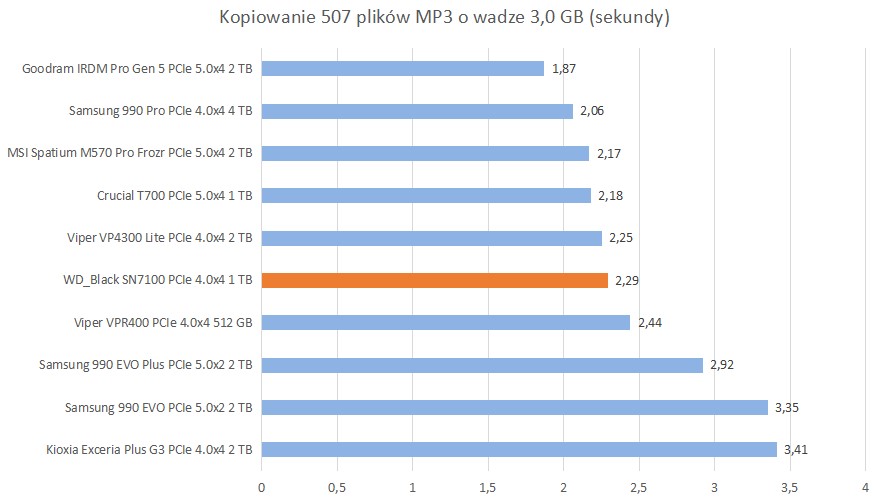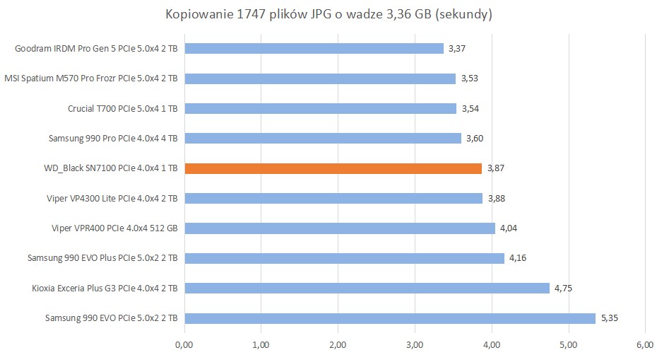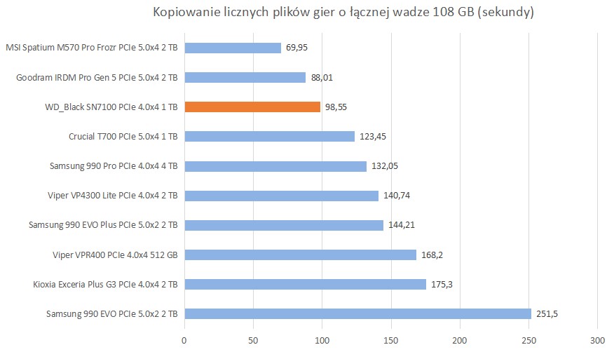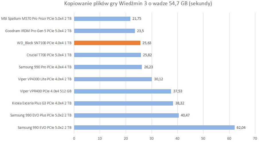 WD_Black SN7100 radzi sobie fenomenalnie w praktycznych testach. Najwięcej mówi nam tutaj wydajność przy kopiowaniu ponad 100-GB paczki plików różnego rodzaju (ot folderu Steam), przegrywając tylko z dyskami nowej generacji na PCIe 5.0.