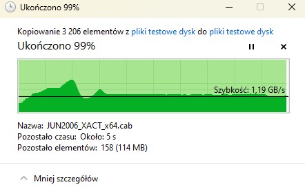 W testach syntetycznych WD_Black SN7100 sprawia wrażenie, że ponad 90-procentowe zapełnienie dysku nie wpływa tak znacznie na wydajność odczytu i zapisu. Co innego mówią jednak testy praktyczne, potwierdzając wydłużenie procesów kopiowania o ponad 50%.