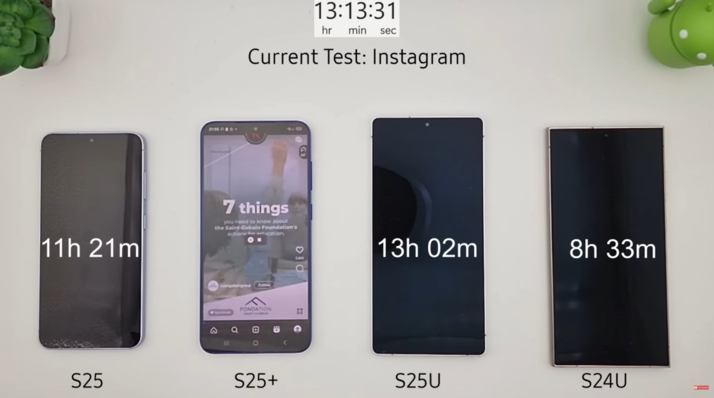 Idealnym przykładem jest tutaj najnowszy test, przeprowadzony przez Android Addicts. Youtuber postanowił sprawdzić żywotność baterii wszystkich modeli Galaxy S25 i porównać ją z zeszłorocznym Galaxy S24 Ultra, a uzyskane wyniki okazały się jednocześnie imponujące i zaskakujące. Twórca testował telefony, wykonując czynności, jakie zwykle na nich wykonujemy, czyli przeglądanie mediów społecznościowych, aplikacji, oglądanie filmów, pozostawianie urządzenia w trybie czuwania, ale oprócz tego uruchomił też kilka testów porównawczych. Trwały one około 40 minut i miały symulować większe obciążenie urządzeń i granie w wymagające gry mobilne.