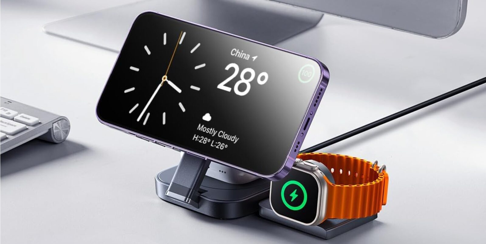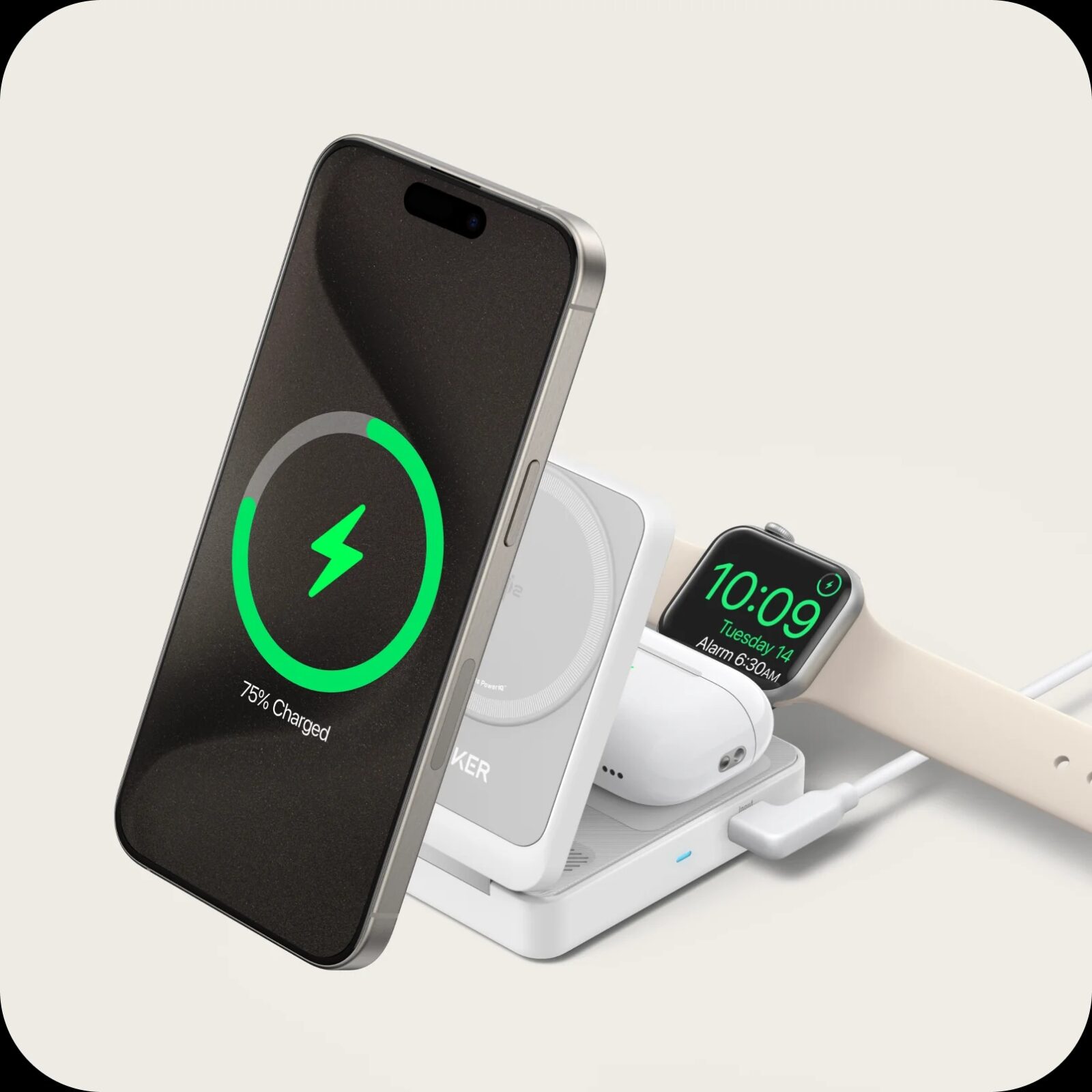 Bezprzewodowa, składana stacja ładująca dla 3 urządzeń, wyposażona w stanowisko ładowania MagSafe/Qi2 o mocy 15 W, płytkę ładowania dla słuchawek oraz dedykowane stanowisko współpracujące ze smartwatchami Apple Watch/Watch Ultra w trybie szybkiego ładowania dla zgodnych modeli. W zestawie ze stacją znajduje się ładowarka PD 40 W.
