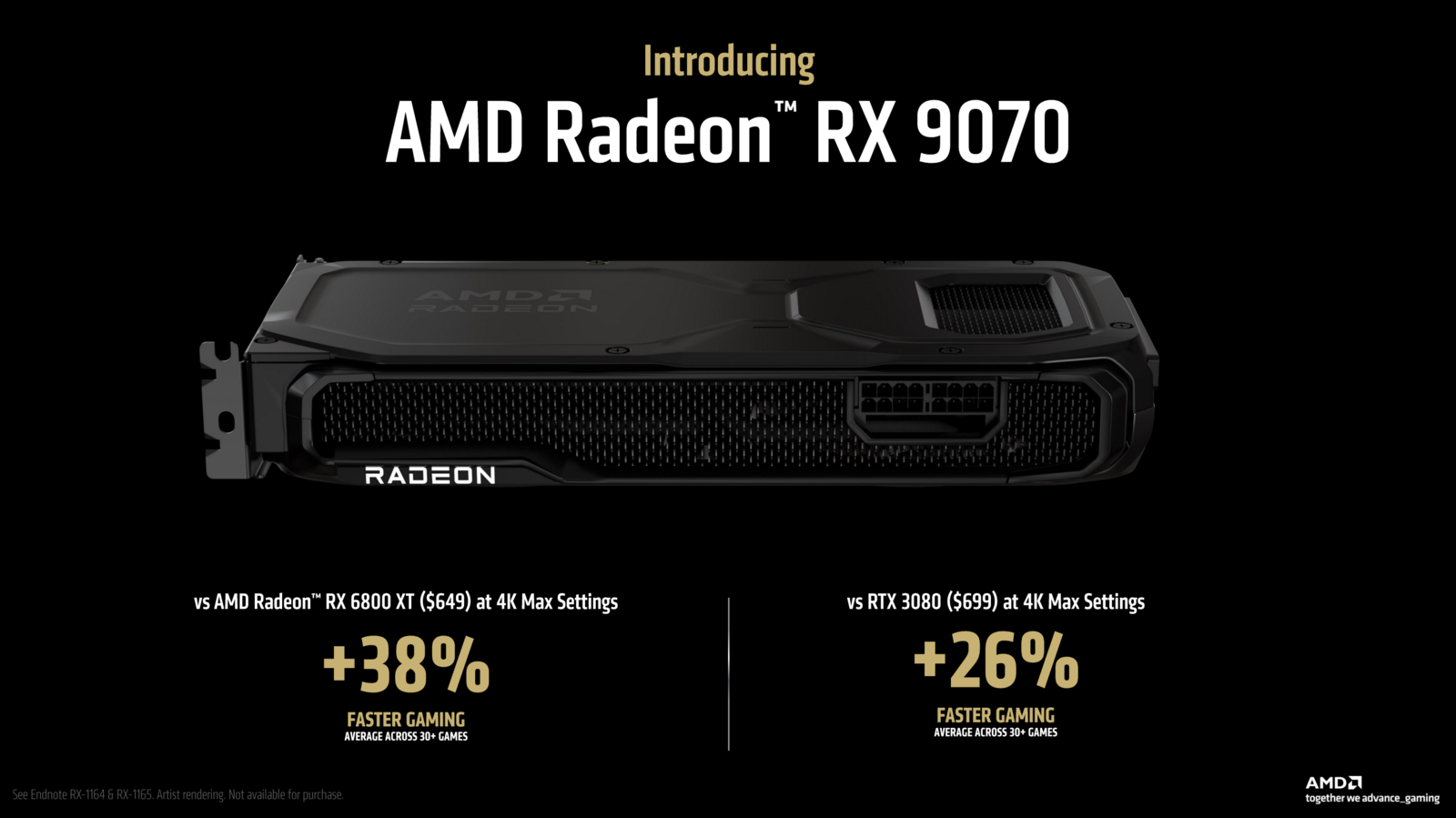 Następny w kolejce to Radeon RX 9070, który wydaje się kartą graficzną znacznie lepiej wyważoną. Ten model bazuje na rdzeniu NAVI 48 XT z 56 aktywnymi blokami CU, 3584 procesorami strumieniowymi, 56 rdzeniami RT 3. generacji oraz 112 rdzeniami AI 2. generacji. Taktowanie rdzenia Boost wynosi odpowiednio 2070 oraz 2520 MHz, w tym przypadku widać największy wpływ na współczynnik TBP, zmniejszony do 220 W. AMD Radeon RX 9070 również zapewnia 16 GB VRAM na 256-bitowej magistrali (20 Gbps) i o przepustowości 640 GB/s. Dodatkowo oferuje wsparcie dla technologii AMD FSR 4, magistralę PCIe 5.0 x16 oraz porty HDMI 2.1b / DisplayPort 2.1a UHBR13.5. Cena MSRP karty to 549 dolarów, a więc tyle samo, co dla GeForce RTX 5070, idąc dalej tym torem w Polsce, powinniśmy oczekiwać, że modele będą startować od około 2849 złotych.