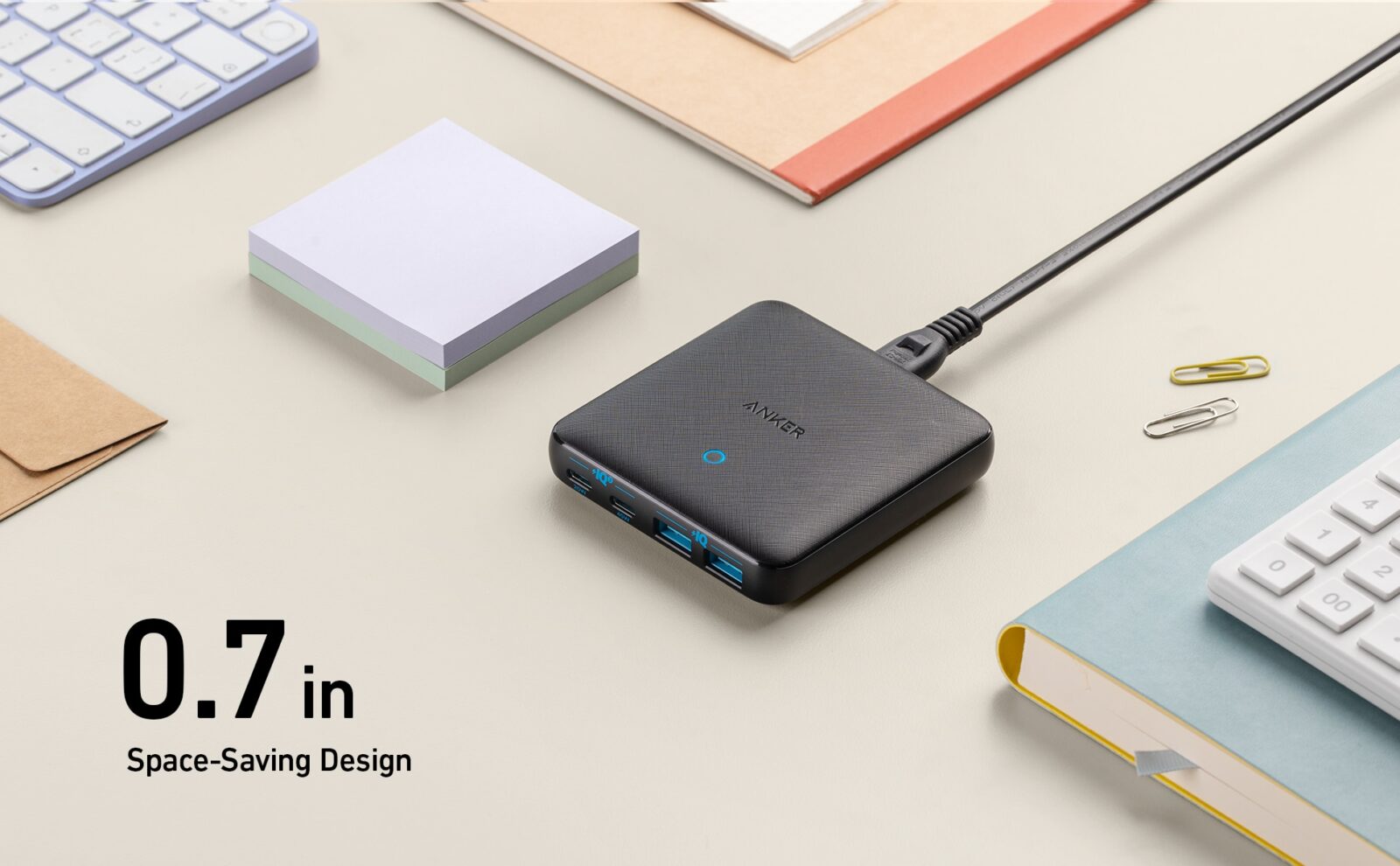 Całkowita moc wyjściowa wynosi 65 W – jeden z portów USB-C ma moc maksymalną 45 W, drugi 20 W – jeśli wykorzystywane są oba, to maksymalna moc wynosi 50 W (30 W+ 20 W), pozostawiając 15 W do podziału na dwa porty USB-A.
