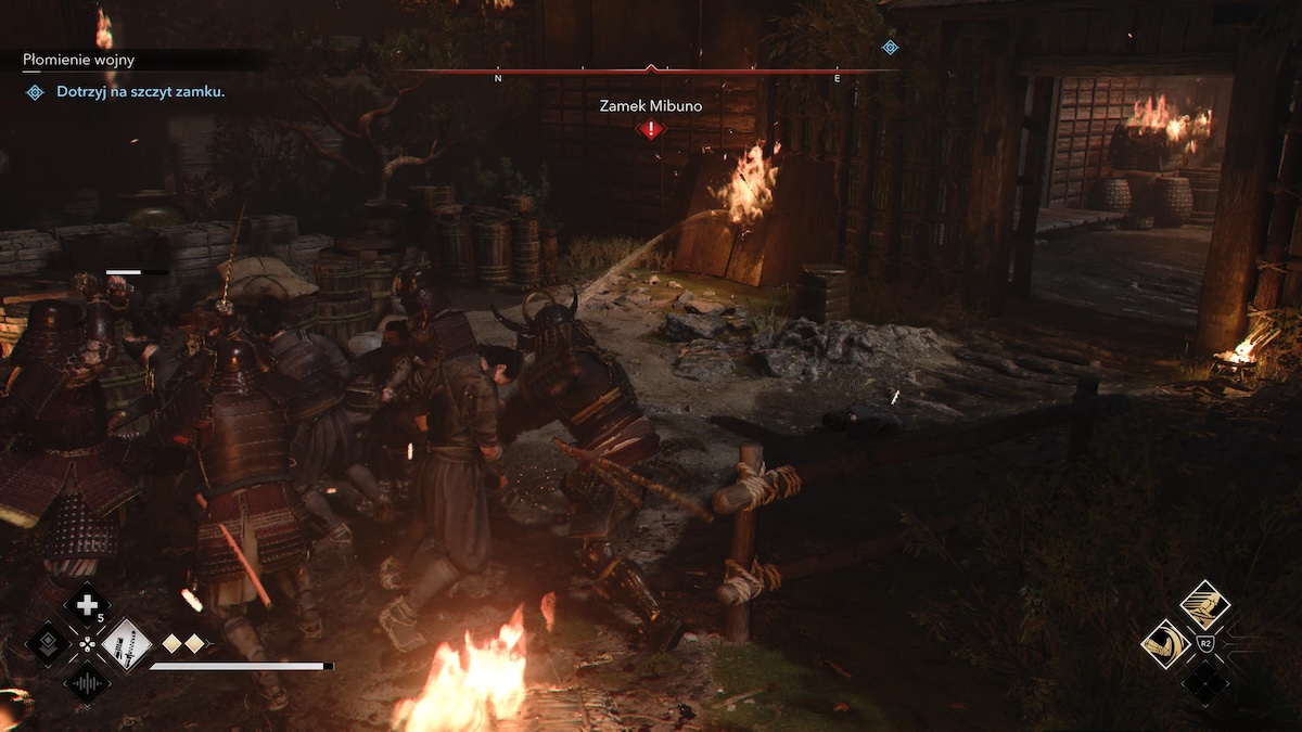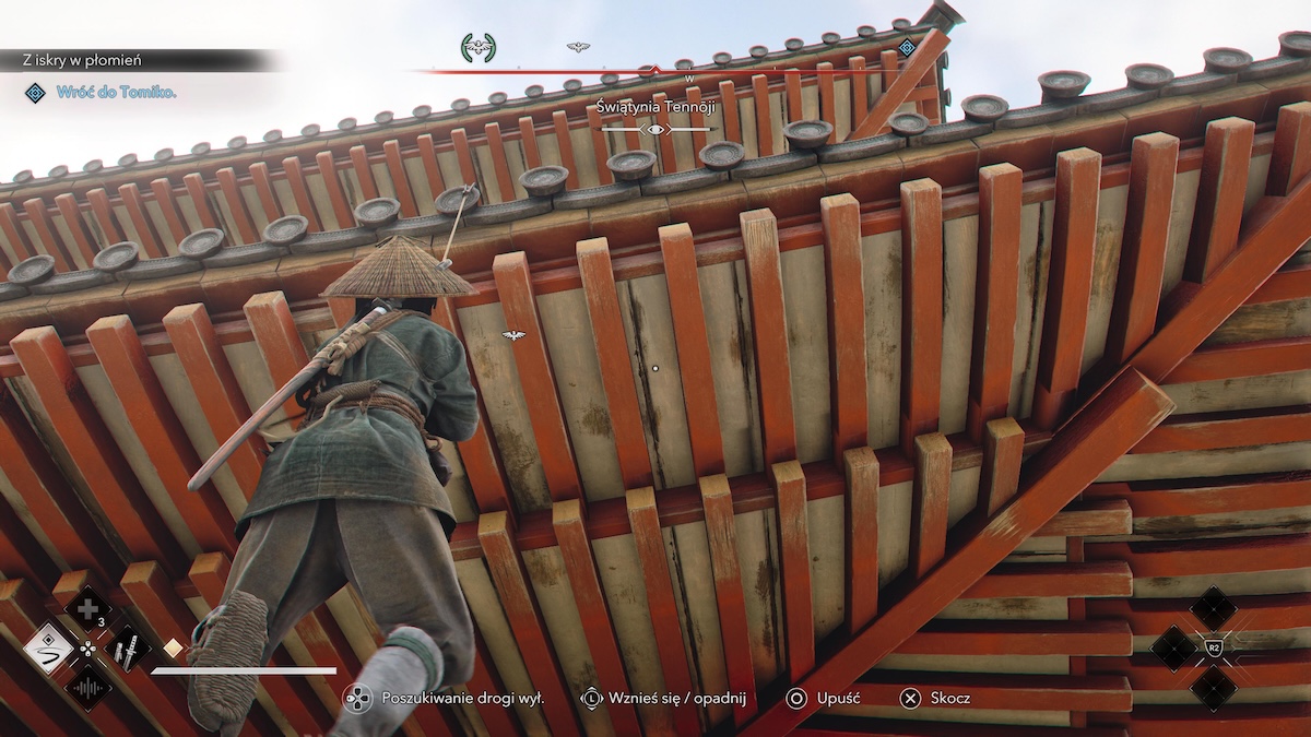 Jeśli na jej drodze jest wysoka ściana bez żadnego punktu do złapania się, wyciągnie hak z liną i najzwyczajniej w świecie w ten sposób dostanie się na dach świątyni, żeby odblokować punkt szybkiej podróży na mapie. Do tego ma opanowany Wzrok Orła, który bardzo przydaje się podczas cichego infiltrowania terenów wroga. Kiedy przychodzi jednak do bezpośredniego starcia… cóż. Naoe potrafi władać małymi rodzajami broni białej (mi najbardziej do gustu przypadła klasyczna katana), ale musimy w walce być bardzo ostrożni — asasynka nie ma mocnego pancerza, co wpływa na nasze HP, więc blokowanie, unikanie i parowanie ataków jest tutaj absolutnie kluczowe. Możemy skorzystać z takich gadżetów jak bomba dymna czy shuriken, ale bezpośrednie starcie z potężnymi samurajami czy roninami nie jest najlepszym pomysłem.
