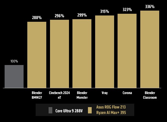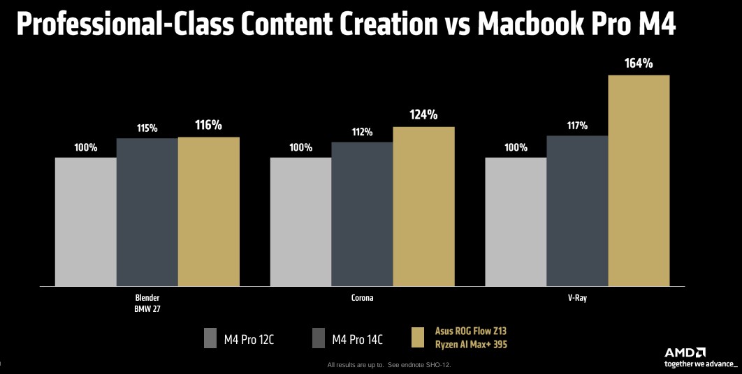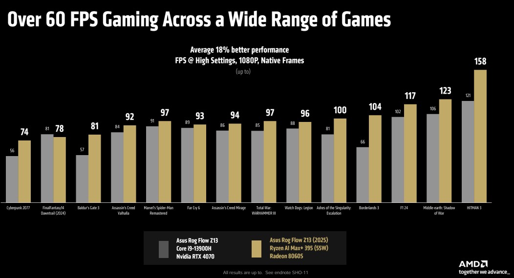 Ryzen AI Max+ 395 jest jednak bezsprzecznie wydajniejszy od Ryzena AI Max+ 390, jako procesor z większą liczbą rdzeni i wątków (16/32 vs 12/24), wyższymi zegarami (5,1 GHz vs 5,0 GHz), pojemniejszą pamięcią podręczną (80 vs 76 MB), lepszym układem graficznym (Radeon 8060S z 40 CU i 80 akceleratorami SI vs Radeon 8050S z odpowiednio 32 CU i 64 akceleratorami). AMD dumnie twierdzi, że ten procesor nie ma sobie równych zarówno w kwestii wydajności graficznej, jak i tej powiązanej ze sztuczną inteligencją w tego typu formacie i w architekturze x86. Nie oznacza to jednak, że w porównaniu do platformy ARM odbiega możliwościami, bo przewyższa w benchmarkach nawet Apple M4 Pro (14c) w Macbooku Pro. W grach sprawa ma się jeszcze lepiej, bo wbudowane iGPU ma przerastać m.in. mobilną kartę graficzną GeForce RTX 4070, a to już niemałe osiągnięcie, jak na integrę.