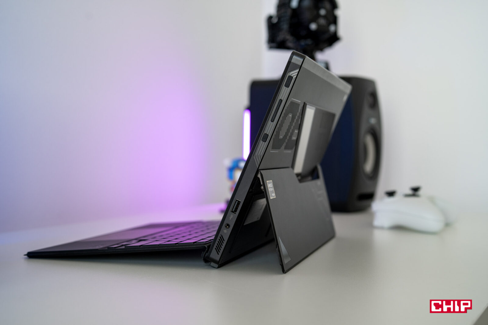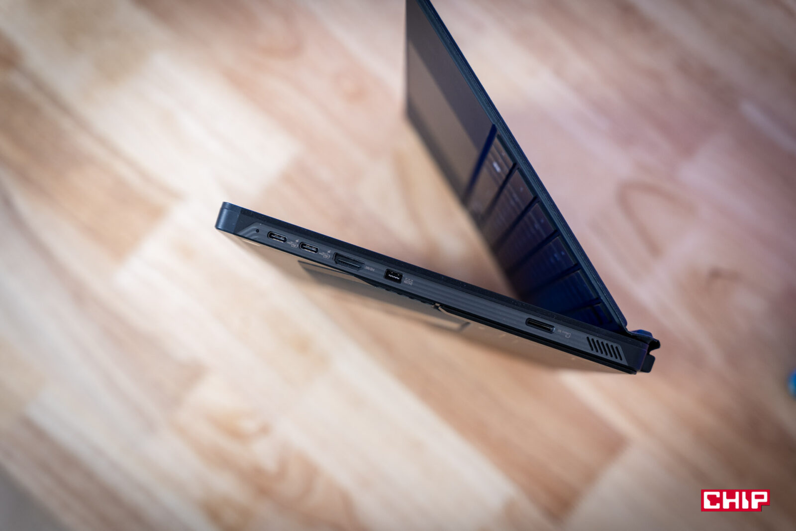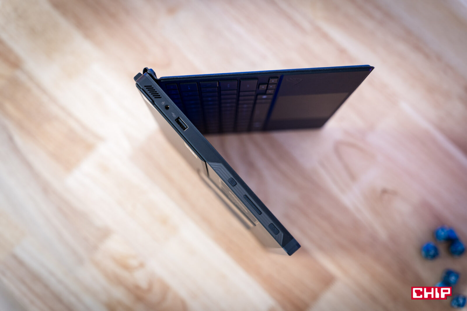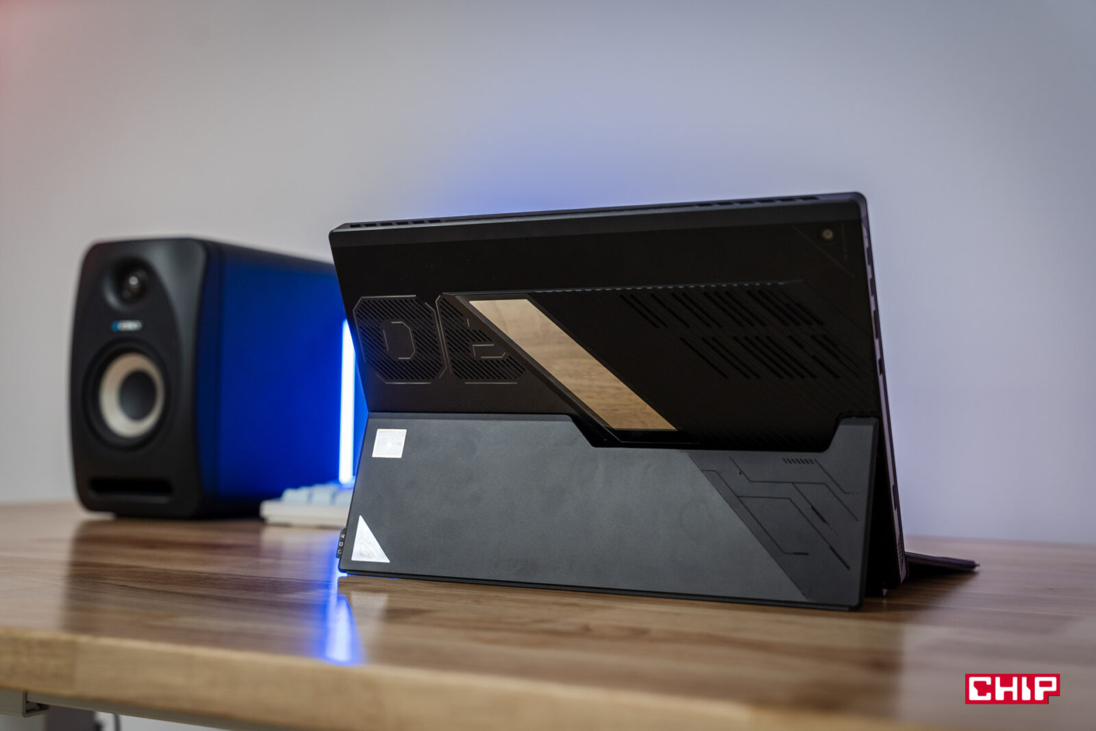 Na całe szczęście producent zadbał jednak o pojemny, bo 70-Wh akumulator, choć musicie zdawać sobie sprawę, że dołączony do zestawu 200-watowy zasilacz nie jest przypadkiem, a zamiast tego potwierdza, że pełnię możliwości tego sprzętu otrzymacie wyłącznie w trybie stacjonarnym. Firmie ASUS zresztą najwyraźniej zależało bardzo na tym, aby zrobić z ROG Flow Z13 2025 możliwie najbardziej stacjonarny tablet i stąd obecność w tym sprzęcie portu HDMI 2.1, dwóch USB4 (40 Gb/s USB-C z trybem DP2.1 i PD 3.0), jednego USB-A 3.2 Gen 2, uniwersalnego portu jack 3,5 mm i czytnika kart pamięci UHS II. Ten zestaw umożliwia m.in. podpięcie do tabletu aż trzech dodatkowych monitorów wysokiej rozdzielczości.