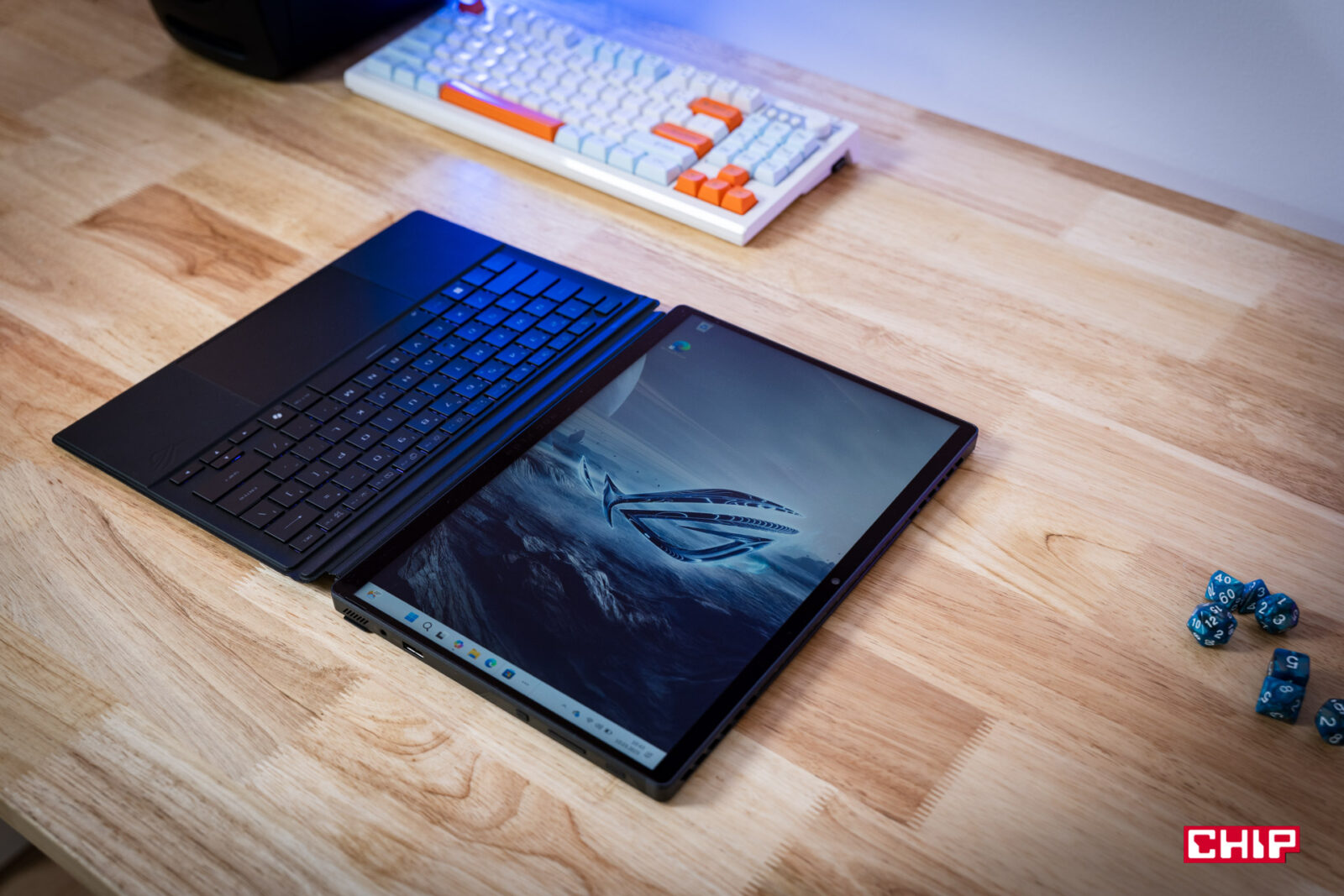 Jak więc korzysta się z ASUS ROG Flow Z13 2025? Tak naprawdę z tym sprzętem będziecie mieć w rękach coś, co może zastąpić wam komputer stacjonarny (z przymrużeniem oka, bo zależy jaki), codziennego laptopa dedykowanego pracy, handhelda i oczywiście typowy tablet, ale nie w momencie, kiedy zależy wam na możliwie najwyższej mobilności. Z racji swojego zaawansowania, ASUS ROG Flow Z13 2025 nie jest najcieńszym tabletem na rynku (mierzy 300 × 204 × 12,9 mm po złożeniu, a z klawiaturą waży 1,59 kg) i nie wytrzyma na jednym ładowaniu tyle, ile zoptymalizowane pod tym kątem tablety z układami ARM. W tym sprzęcie siedzi stara dobra architektura x86, która z jednej strony gwarantuje możliwość bezproblemowego odpalenia m.in. Windowsa 11, wszystkich programów czysto pecetowych i tym samym gier, ale z drugiej zużywa więcej energii.
