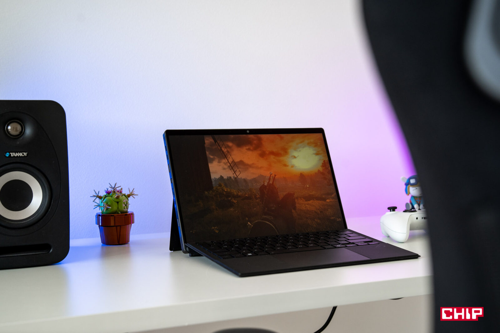 Podkreślę tutaj jednak, że w trybie stacjonarnym ROG Flow Z13 nadal potrzebuje drugiego, zewnętrznego monitora, aby zapewnić komfortową pracę lub rozrywkę. 13,4-calowy ekran ROG Nebula o rozdzielczości WQXGA (2560×1600), częstotliwości odświeżania rzędu 180 Hz, pokryciu 100% palety DCI-P3 i jasności na poziomie 500 nitów, to ciągle tylko 13-calowa przestrzeń robocza i większa rozdzielczość o standardowego Full HD wcale tego nie poprawia. W trybie tabletu problem ten znika, bo twarz mamy zwyczajnie bliżej sprzętu i klikamy w ekran tak, jak w telefon, nie musząc przejmować się jednocześnie zarysowaniami (dba o to szkło Gorilla Glass DXC).