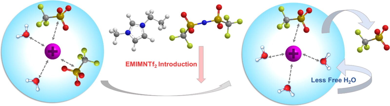 Oto jednak chińscy naukowcy opracowali nowy układ hybrydowego elektrolitu, łączący wodę, ciecz jonową (EMIMNTf₂) oraz trifluorometanosulfonian potasu (KOTf). Zazwyczaj ciecz jonowa i woda są trudne do połączenia, ale w tym przypadku dodatek soli potasowej stabilizuje mieszaninę. Ta trójskładnikowa konfiguracja reorganizuje interakcje pomiędzy wodą a jonami potasu, znacząco ograniczając skłonność wody do rozkładu przy wyższych napięciach. Dzięki takiej nowej konfiguracji maksymalne napięcie operacyjne superkondensatora wzrosło do 3,37 V, a więc niemal trzykrotnie więcej niż w przypadku tradycyjnych elektrolitów wodnych, które są ograniczone do około 1 V, co zbliża tę technologię do parametrów niskonapięciowych ogniw litowo-jonowych. To jednak nie koniec zalet tej nowej mieszanki elektrolitowej.