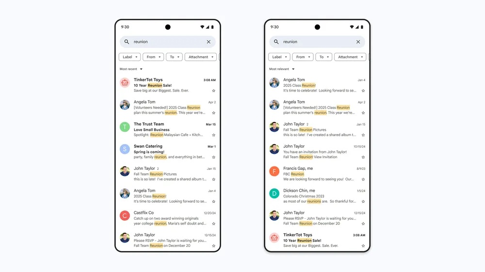 Przeszukiwanie skrzynki pocztowej przypomina szukanie igły w stogu siania, szczególnie przy objętości sięgającej kilkunastu (a bywa, że i kilkudziesięciu tysięcy wiadomości). Z pomocą przychodzi AI, a konkretnie rodzina modeli Gemini i algorytmy, które będą brać pod uwagę trafność znalezionych informacji, bazując na kilku istotnych czynnikach (w pierwszej kolejności podsunie nam m.in. dane od kontaktów, z którymi częściej się w ostatnim czasie kontaktowaliśmy, a także weźmie pod uwagę częstotliwość klikania na konkretne wiadomości w skrzynce).