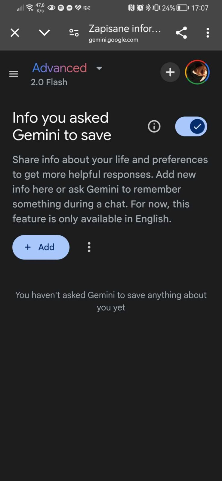 Jak widzicie na powyższych zrzutach ekranu, po kliknięciu w sekcję “Zapisane informacje”, jesteśmy przenoszeni do witryny, na której możemy je dodać. Gigant zaznacza jednak, że jest to obecnie opcja dostępna jedynie w języku angielskim, więc chociaż mogę już tam dodać jakieś własne preferencje, te nie są jeszcze uwzględniane w rozmowie, nawet jeśli prowadzę ją z Gemini po angielsku. Spodziewam się, że wkrótce zostanie dodana obsługa innych języków, a funkcja stanie się powszechnie dostępna.