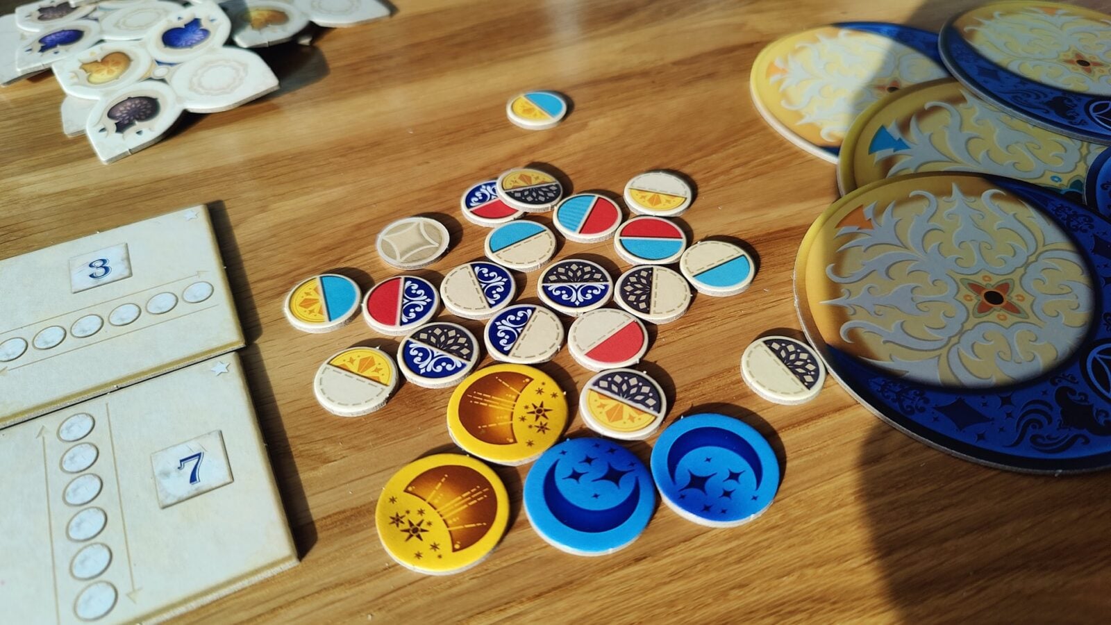 Azul: Pojedynek nie jest prosty do ogarnięcia i poziom zaawansowania zestawu wcale w tym nie pomaga. Do dyspozycji dostajemy bowiem m.in. dwie plansze dla graczy, jedną planszę punktacji, cztery małe i jeden duży warsztat z podziałem na dwie części, 20 bonusowych żetonów specjalnych z tektury, 75 akrylowych płytek do ustawiania w swoich kompletowanych na bieżąco kopułach oraz 18 kafelków kopuły podzielonych na dwa rodzaje. Nasz cel w tej grze jest prosty – rozpoznać najbardziej premiujące zestawy płytek na daną grę (regrywalność zwiększa 8 różnych, losowanych w momencie przygotowywania gry celów na 4 dwustronnych kafelkach celów), poustawiać najsensowniej kafelki kopuły oraz taktycznie dobierać w ciągu pięciu rund akrylowe płytki, aby zdobyć możliwie najwięcej punktów.