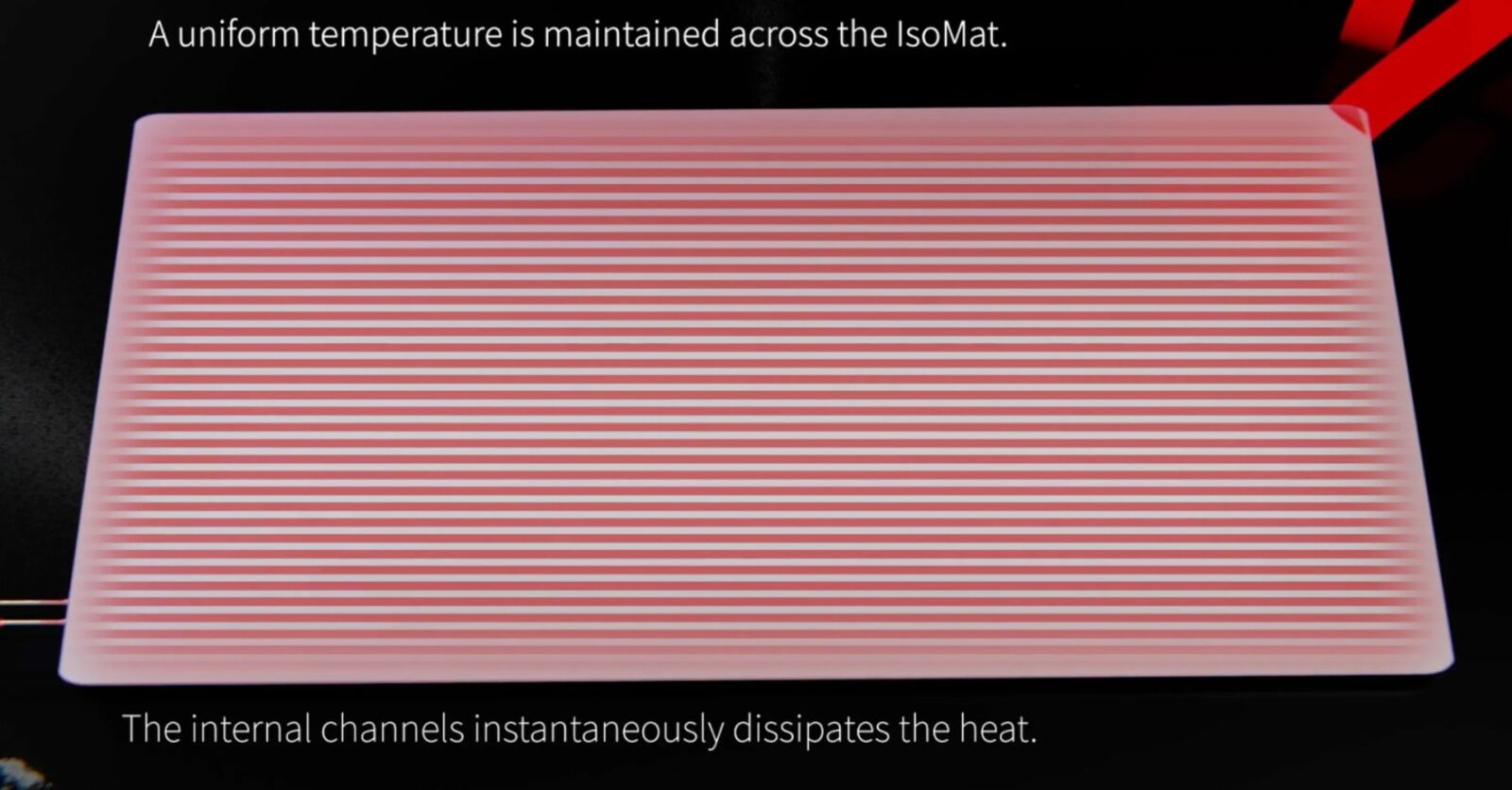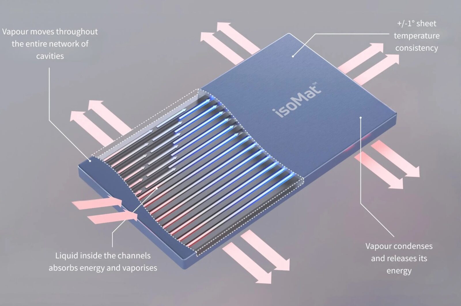 IsoMat działa na podobnej zasadzie, jak tradycyjne ciepłowody, choć na znacznie większą skalę. Gdy tylko jedna część maty się nagrzewa, płyn natychmiast zaczyna wrzeć, przemieszcza się i rozprowadza ciepło po całej powierzchni, tworząc niemal natychmiastowy transfer ciepła. Dzięki temu IsoMat jest nawet 5000 razy bardziej efektywny niż miedź czy aluminium, a dostosowanie temperatury wrzenia cieczy roboczej pozwala na idealne dopasowanie do konkretnych zastosowań.