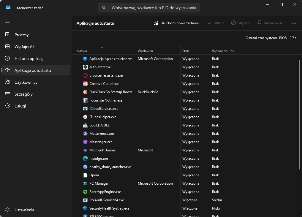 - Wpływ na uruchamianie: Określa, jak bardzo dana aplikacja spowalnia uruchamianie systemu (Wysoki, Średni, Niski, Niezmierzony).