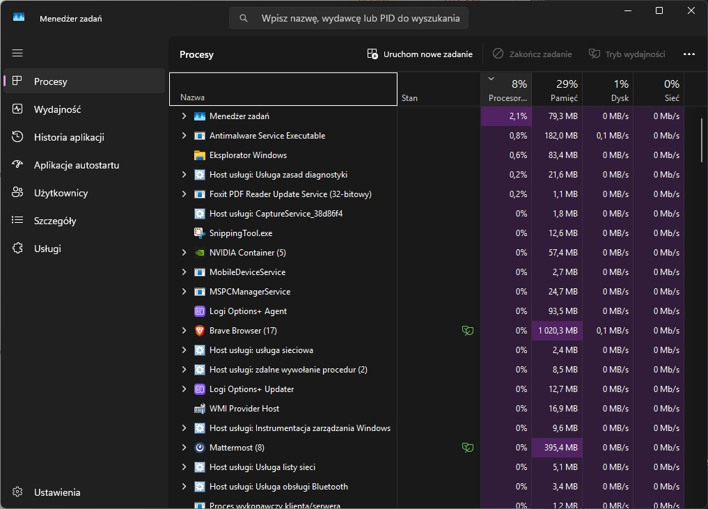 - Pamięć: ilość pamięci RAM (w MB lub GB) używanej przez proces. Duże zużycie pamięci może spowalniać system;