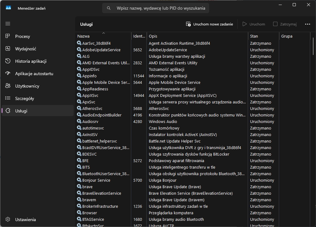 - PID: identyfikator procesu (jeśli usługa jest uruchomiona);