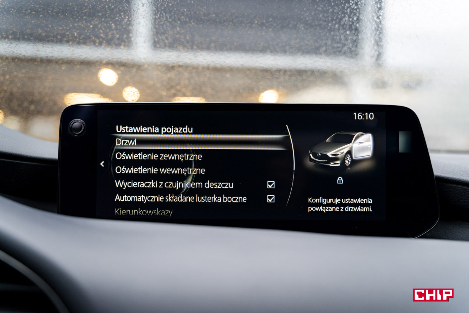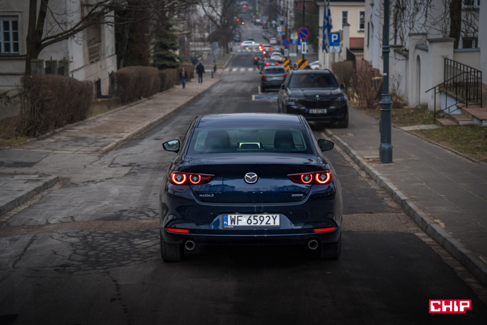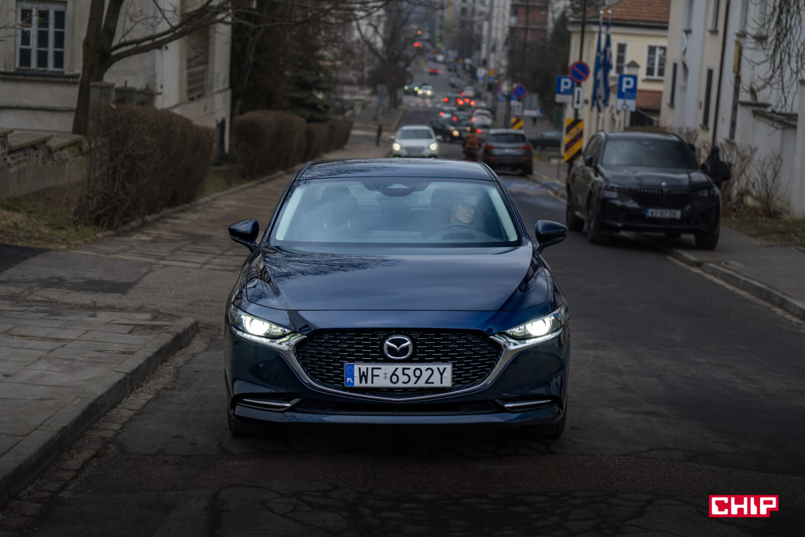 Poza dziwacznie umieszczonym ekranem centralnym, wnętrze Mazdy 3 ma jeszcze jedną wadę – pozycję za kierownicą. Jest nisko i to mi absolutnie nie przeszkadzało, ale czułam się wręcz obudowana drzwiami. Szyba umieszczona jest wysoko, ja siedziałam nisko i w efekcie widoczność z boku pozostawiała wiele do życzenia. O ile podczas parkowania nie stanowiło to problemu dzięki systemowi kamer 360°, o tyle podczas jazdy potrafiło sprawiać kłopoty. Wysoko umieszczona szyba w połączeniu z szerokimi słupkami sprawiały mi problemy w zauważaniu pieszych i rowerzystów na przejściach. Jazda wymagała o wiele większej ostrożności, niż można się było tego na pierwszy rzut oka spodziewać.
