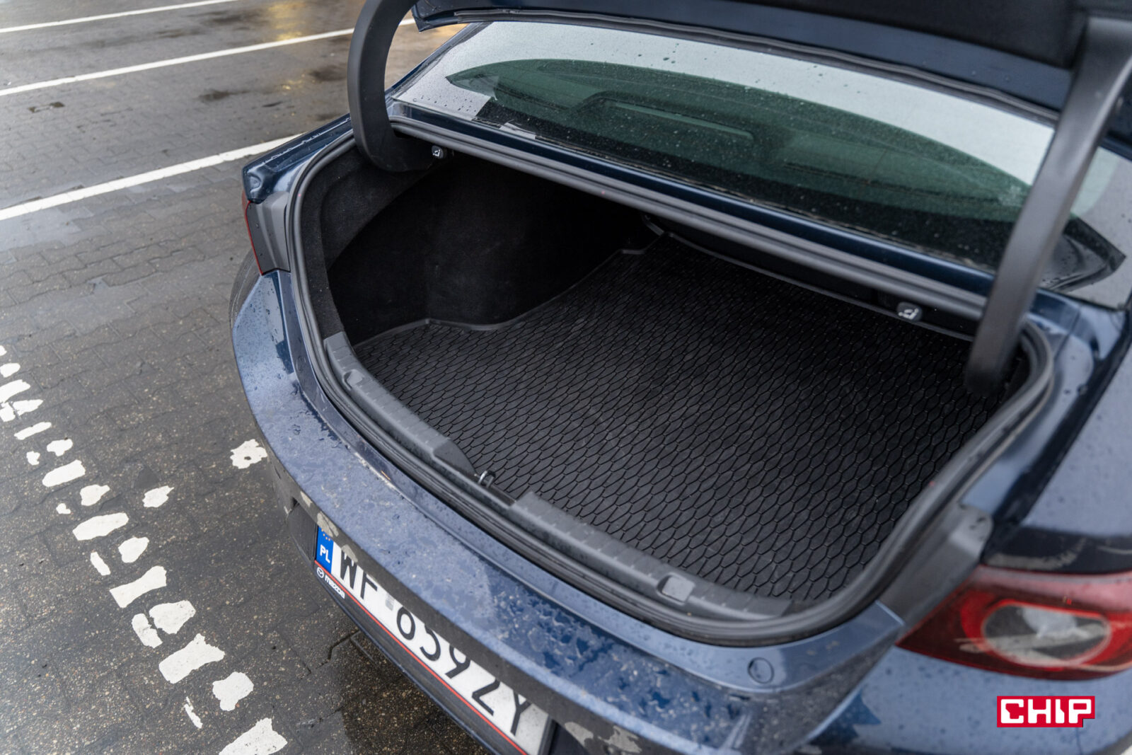 Bagażnik katalogowo jest spory, bo ma pojemność 450 litrów. Jak to bywa w sedanach, zapakujemy do niego dużo, ale niekoniecznie duże rzeczy. Otwór załadunkowy jest ograniczony konstrukcją auta, za to sam bagażnik jest długi, więc jeśli chodzi o jakieś duże zakupy czy torby lub walizki to zmieści się ich tu całkiem sporo.