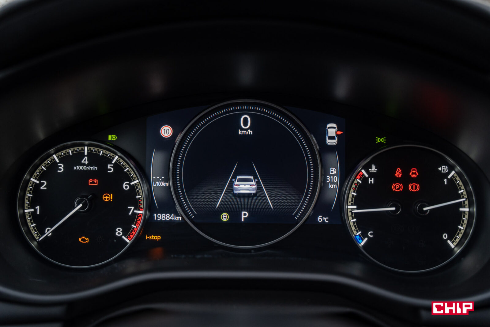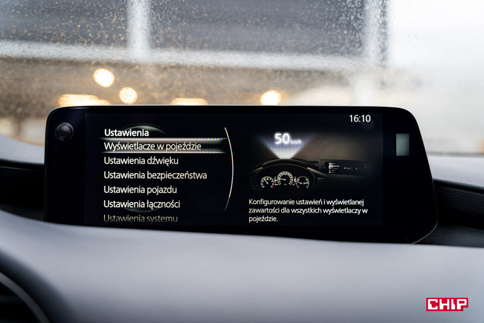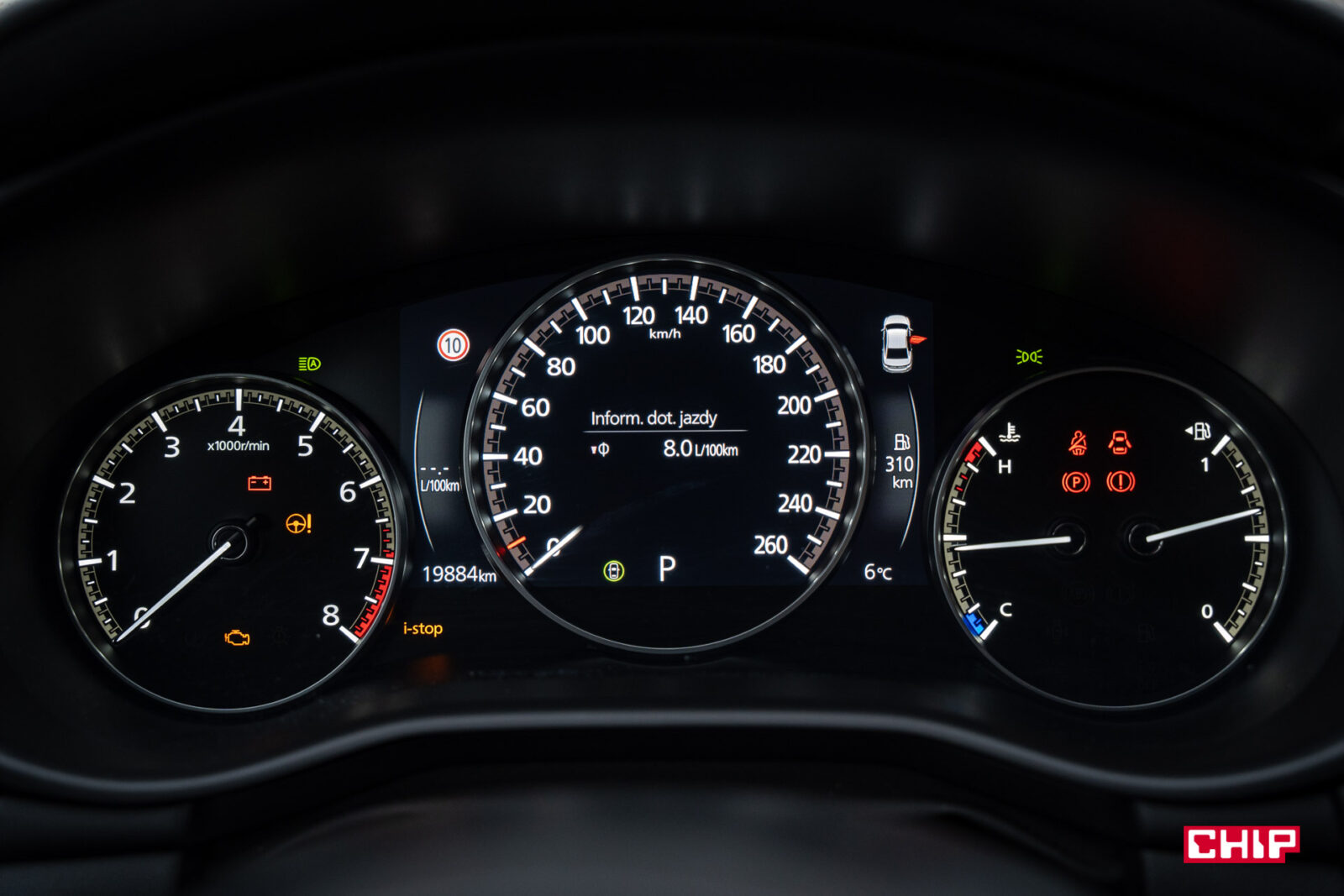 Ekran kierowcy na pierwszy rzut oka jest niemal niewidoczny. Wyświetlany na nim zegar wygląda jak fizyczny i pomimo wieku konstrukcji nadal robi bardzo pozytywne wrażenie. Widok prędkościomierza możemy zmienić tylko na prosty widok działania asystenta jazdy z aktywnym tempomatem, więc dodatkowych opcji w zasadzie tu nie ma. Możemy zmieniać tylko typ informacji wyświetlanej po bokach prędkościomierza. Choć jest to proste, to sam panel zegarów Mazdy 3 nadal wygląda bardzo dobrze.