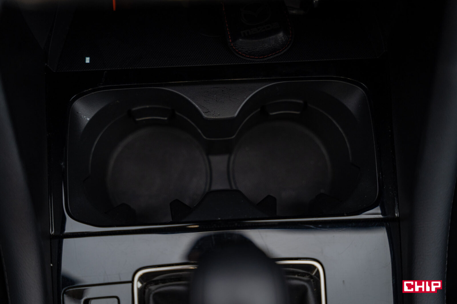 Wnętrze jest ciemnie, co z jednej strony nieco podbija uczucie elegancji, ale z drugiej… no jest tu ciemno. Przydałoby się tu lekki odświeżenie z dodaniem jakiegoś elementu świetlnego. Ciemno jest też przez to, że widoczność w Maździe 3 jest mocno taka sobie. O czym więcej za moment.