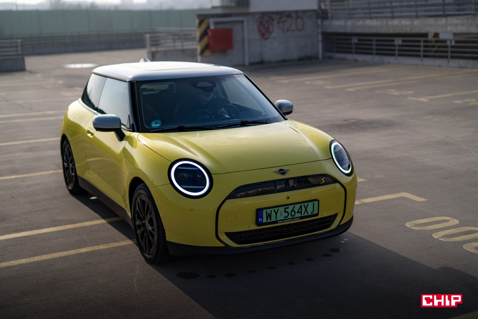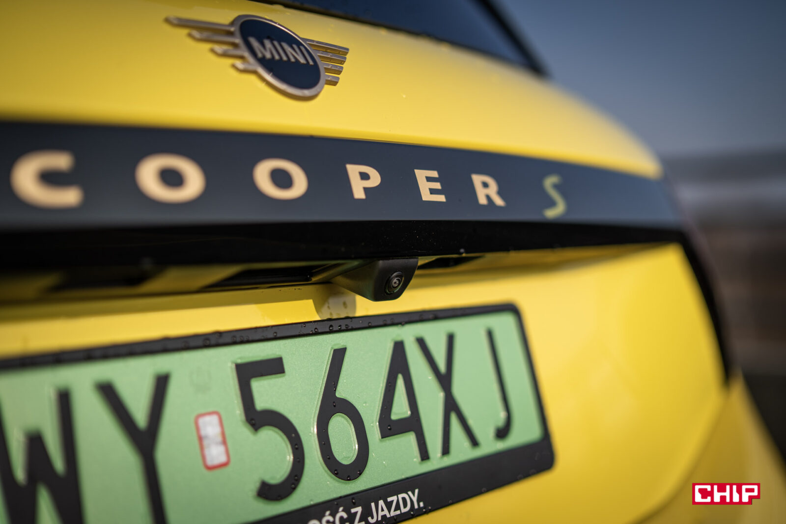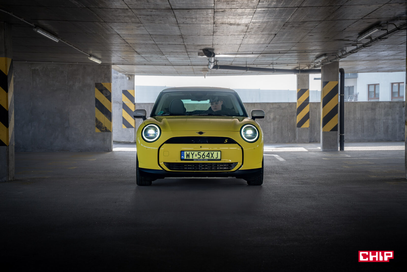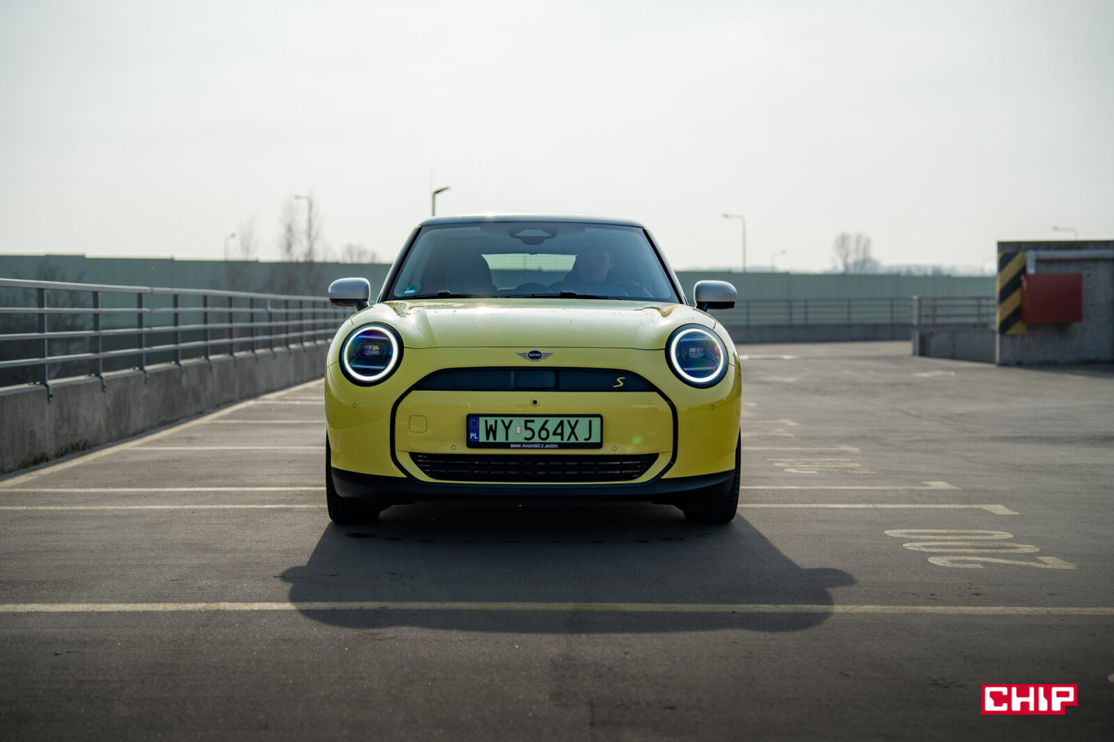 MINI Cooper SE wygląda z zewnątrz dokładnie tak samo, jak jego spalinowy odpowiednik i właściwie jedynym elementem, który zdradzi nam elektryczny napęd (poza kulturą jazdy) są wspomniane już zielone tablice rejestracyjne. Egzemplarz testowy dostałem jeszcze w żółciutkim, kanarkowym odcieniu, co dodaje temu samochodowi uroku, chociaż nasze połączenie stylistyczne mogło być dość specyficzne — ale finalnie całkiem się polubiliśmy.