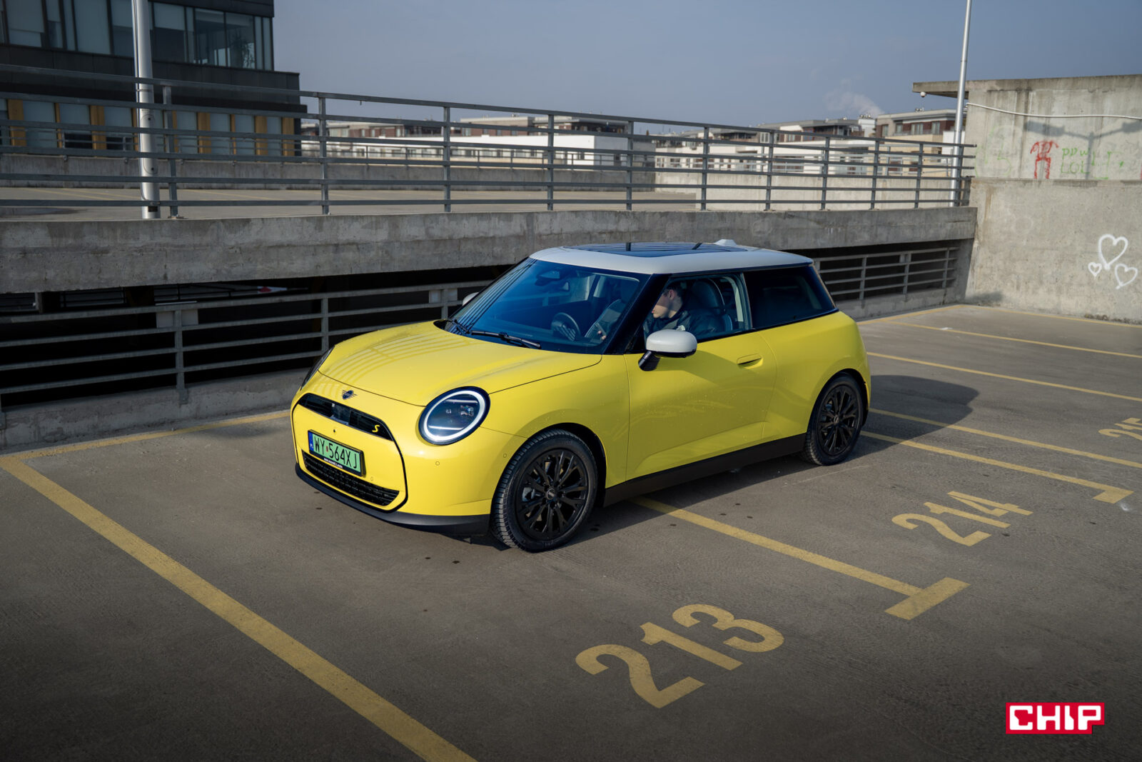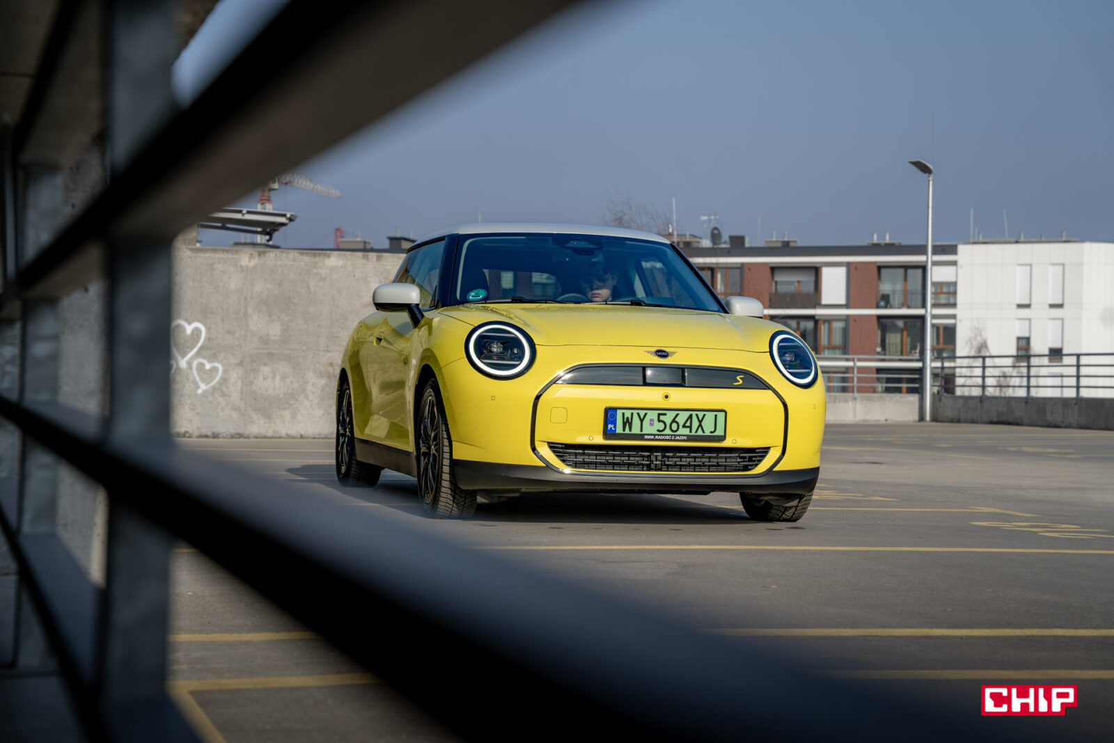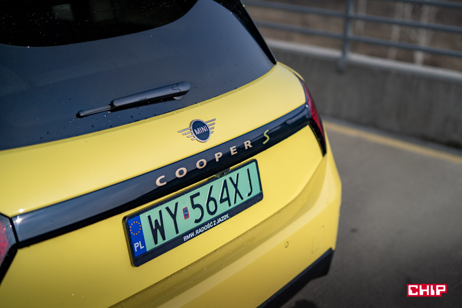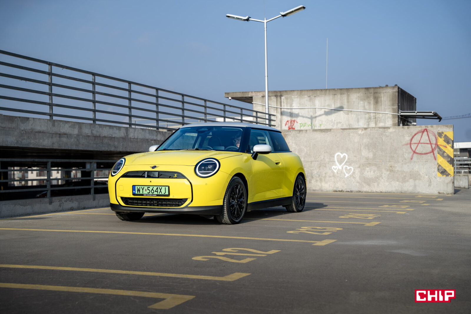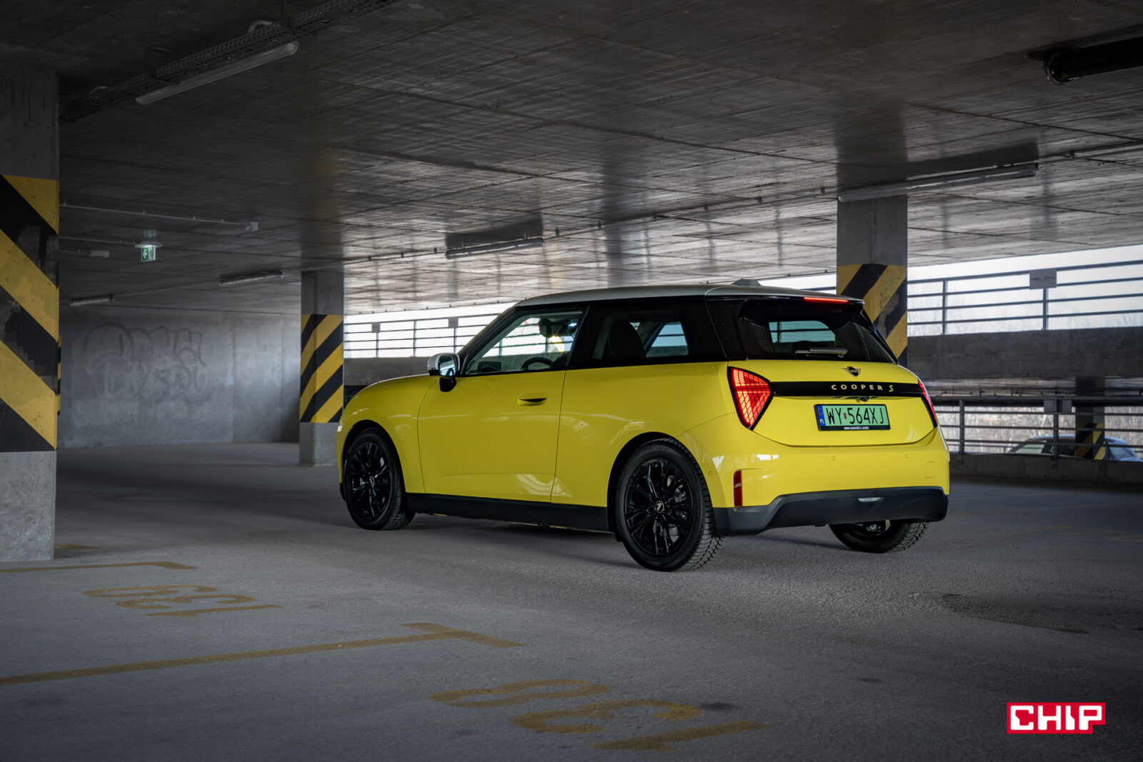 MINI Cooper SE wygląda z zewnątrz dokładnie tak samo, jak jego spalinowy odpowiednik i właściwie jedynym elementem, który zdradzi nam elektryczny napęd (poza kulturą jazdy) są wspomniane już zielone tablice rejestracyjne. Egzemplarz testowy dostałem jeszcze w żółciutkim, kanarkowym odcieniu, co dodaje temu samochodowi uroku, chociaż nasze połączenie stylistyczne mogło być dość specyficzne — ale finalnie całkiem się polubiliśmy.