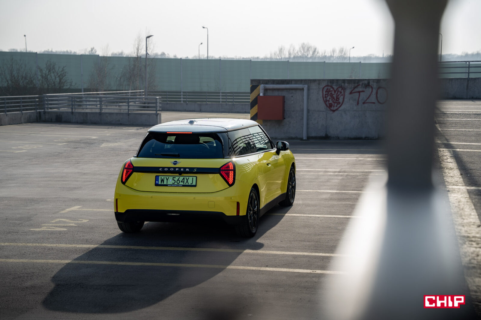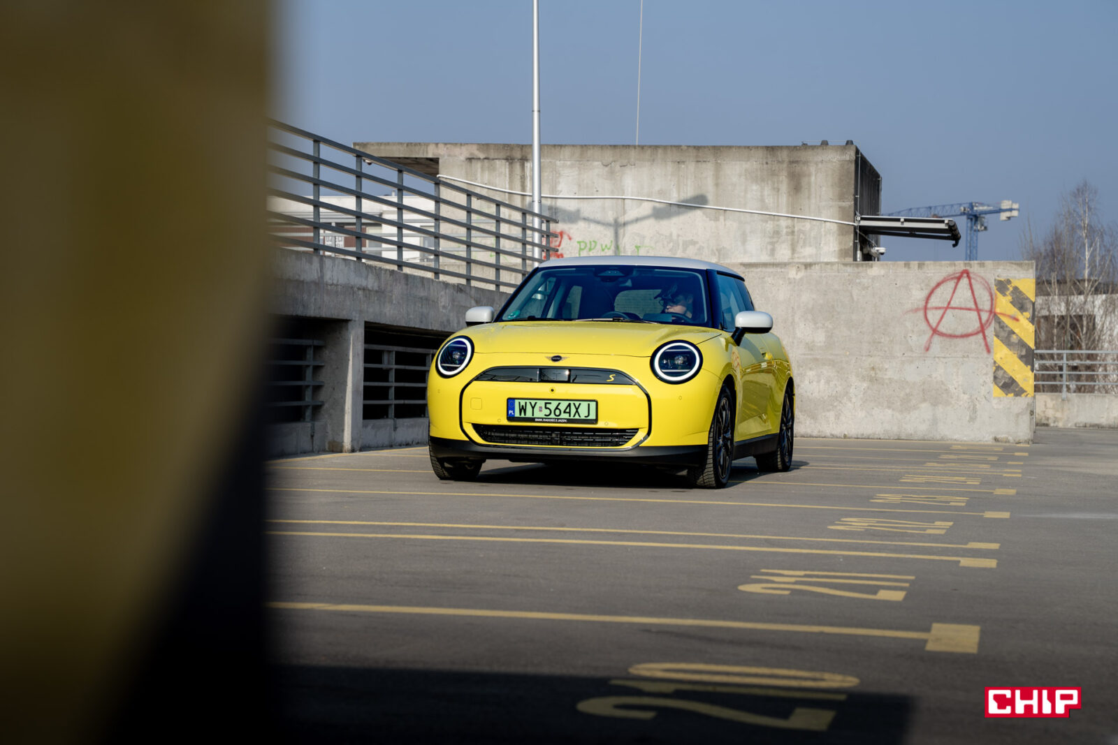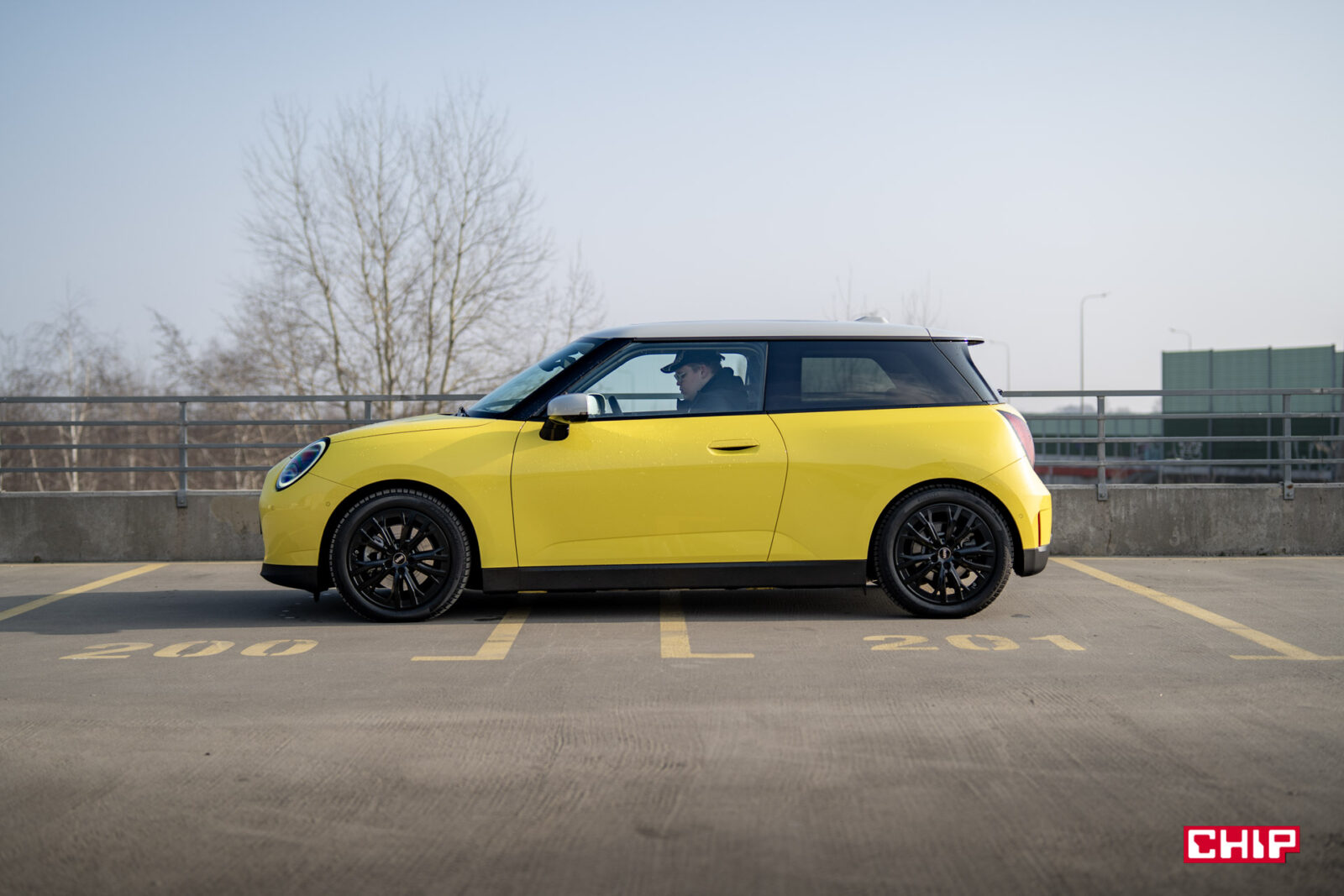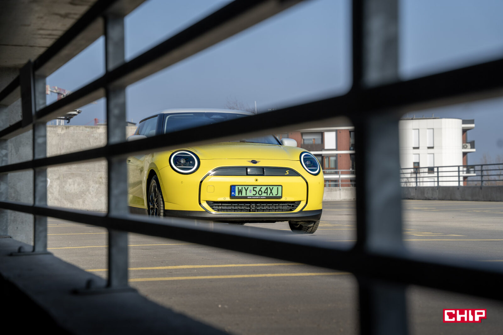 MINI Cooper SE wygląda z zewnątrz dokładnie tak samo, jak jego spalinowy odpowiednik i właściwie jedynym elementem, który zdradzi nam elektryczny napęd (poza kulturą jazdy) są wspomniane już zielone tablice rejestracyjne. Egzemplarz testowy dostałem jeszcze w żółciutkim, kanarkowym odcieniu, co dodaje temu samochodowi uroku, chociaż nasze połączenie stylistyczne mogło być dość specyficzne — ale finalnie całkiem się polubiliśmy.