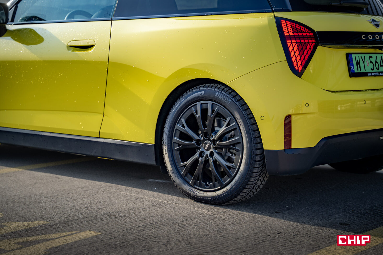 Z tyłu uwagę zwracają lampy LED z motywem Union Jack, chociaż nie jest to już tak bezpośrednie i oczywiste jak kiedyś. Jak już wspominałem, jest tu sporo nowoczesnych i nieco futurystycznych elementów, chociaż gdyby odjąć nowe rozwiązania, to trudno byłoby od razu rozpoznać, czy to nowy samochód, czy kilkudziesięcioletni model — i to jest świetna decyzja projektowa! Do tego dochodzą takie akcenty jak miedziane logo MINI na tylnej klapie czy napis COOPER na czarnym pasie, kontrastującym z jasnym lakierem samochodu, również w miedzianym odcieniu. Nie można zapomnieć o 17-calowych kołach z alufelgami U-Spoke, które są bardziej stonowane i „classy”, lub 18-calowych z aluminiowymi obręczami Night Flash Spoke 2-tone, które zdecydowanie bardziej pasują do całej tożsamości marki, chociaż mogą się gryźć z niektórymi lakierami.