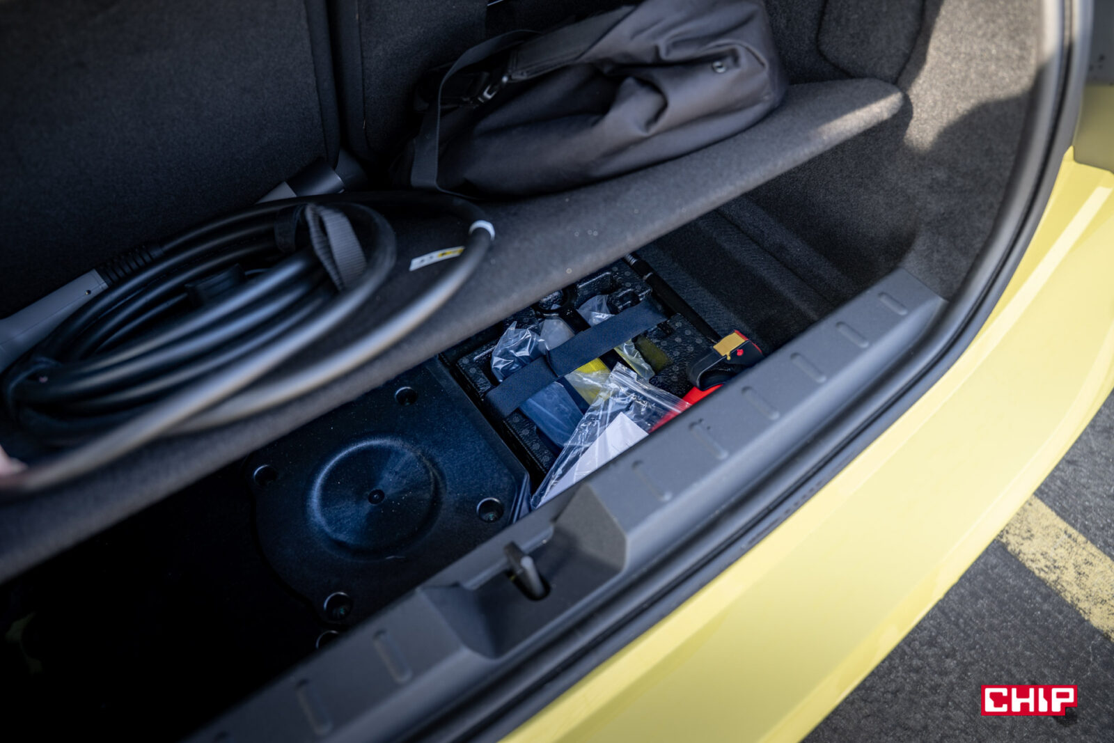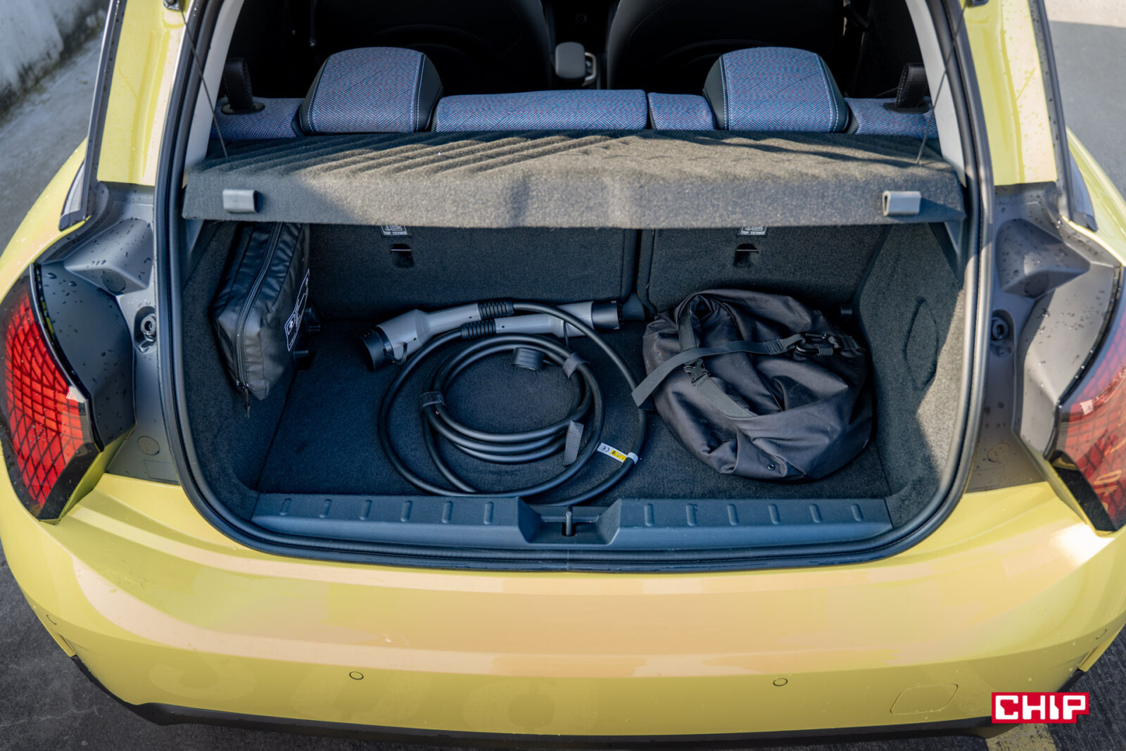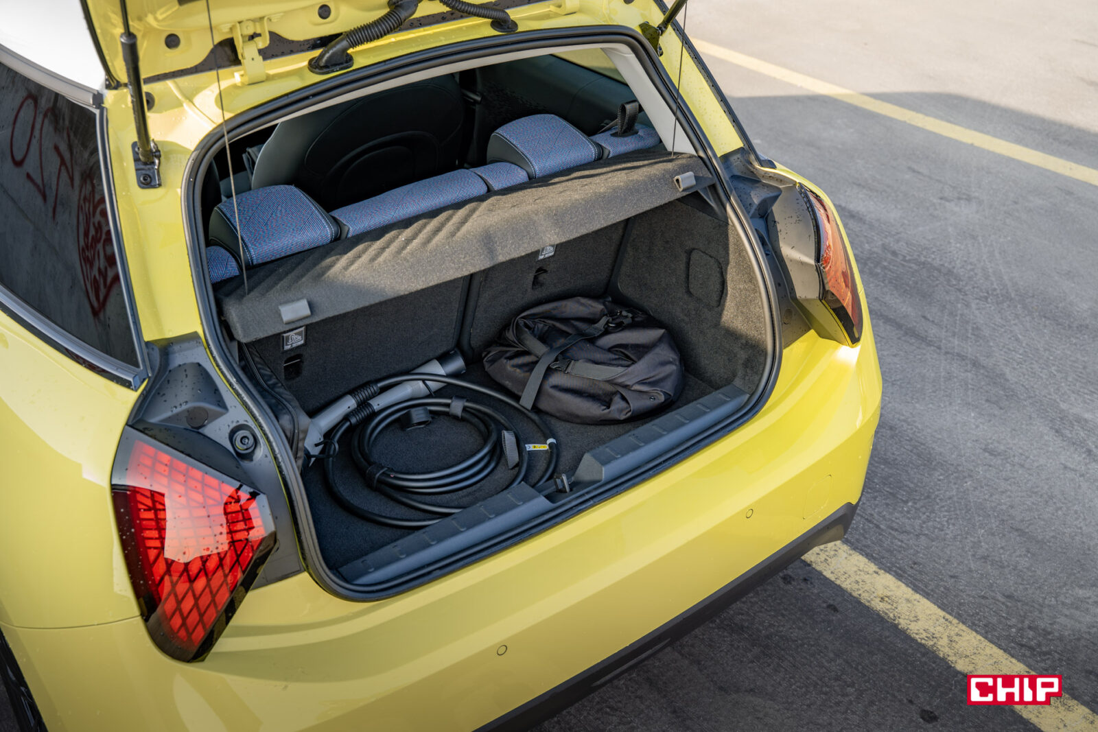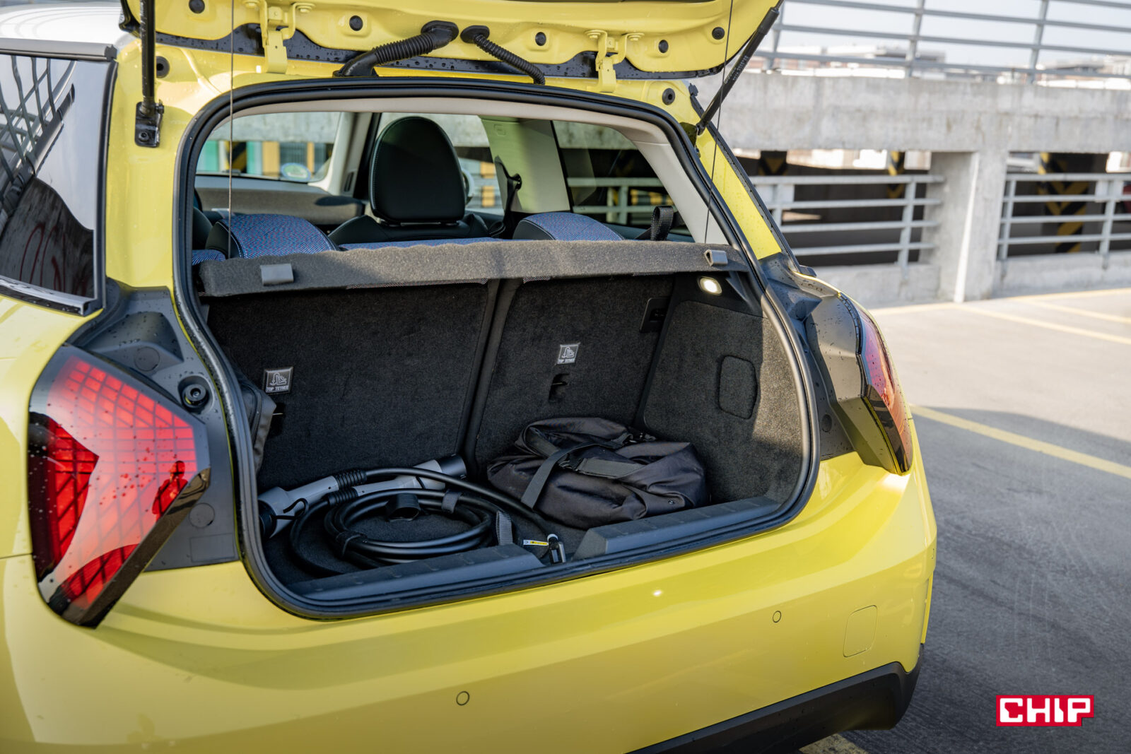 Miejsca nie ma wiele więcej w bagażniku. Ten oferuje zaledwie 211 litrów pojemności, która po złożeniu siedzeń rośnie do około 731 litrów. Dwie duże torby z zakupami i kabel do ładowania samochodu praktycznie wypełniają całą dostępną przestrzeń. Tego jednak można się spodziewać — w końcu to MINI Cooper — ale mocno rozczarował mnie brak automatycznej klapy bagażnika w testowanym egzemplarzu. Bagażnik otwieramy i zamykamy w pełni ręcznie, co było sporym zaskoczeniem.