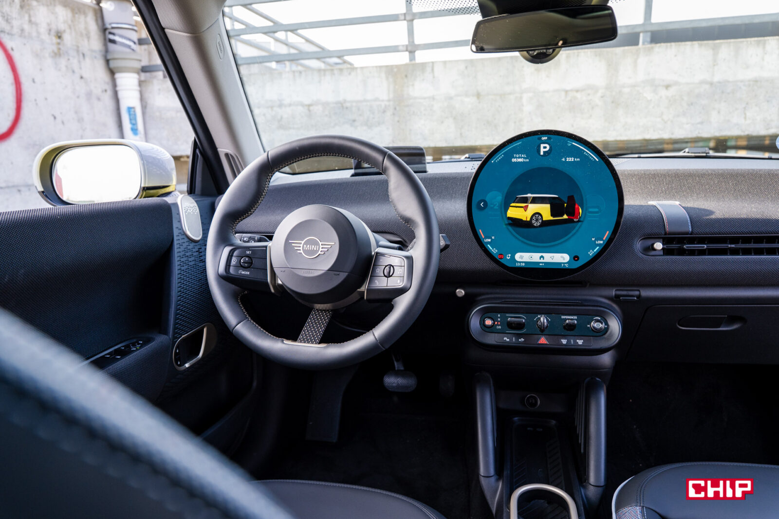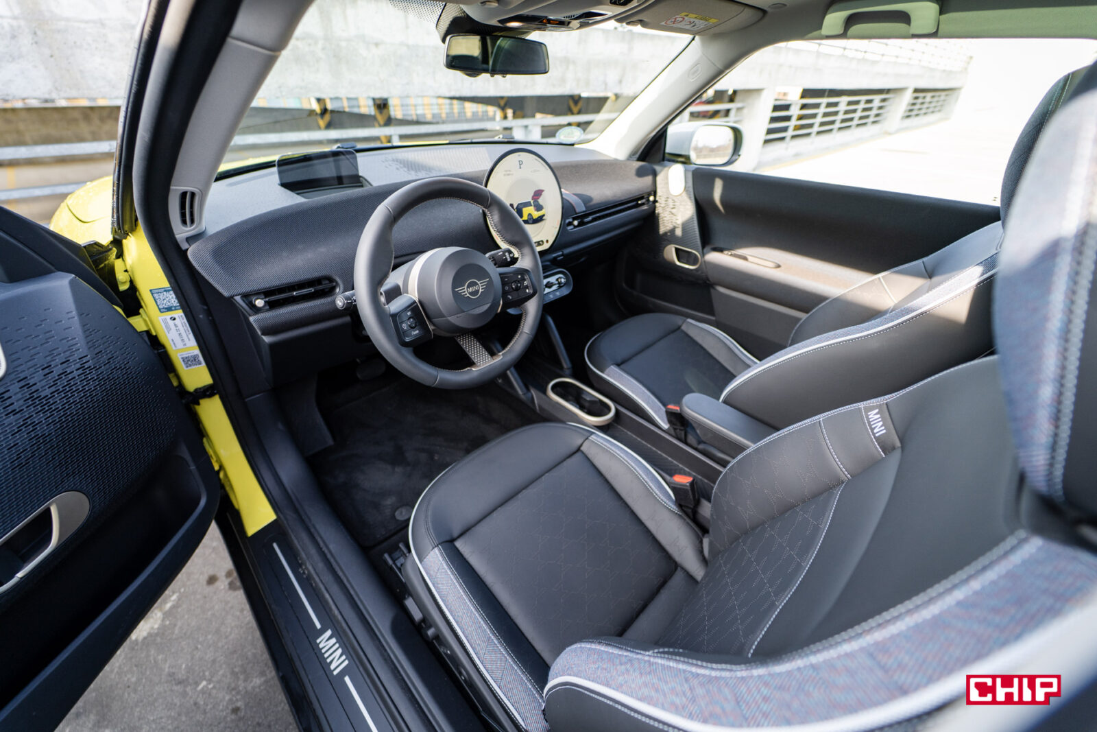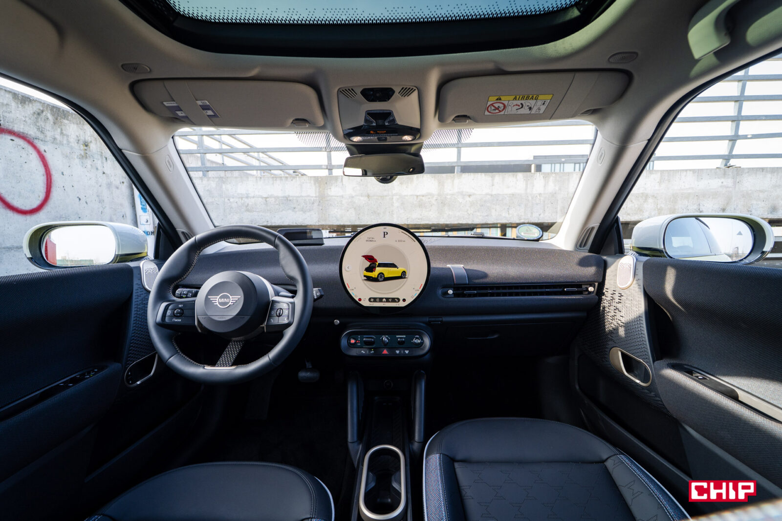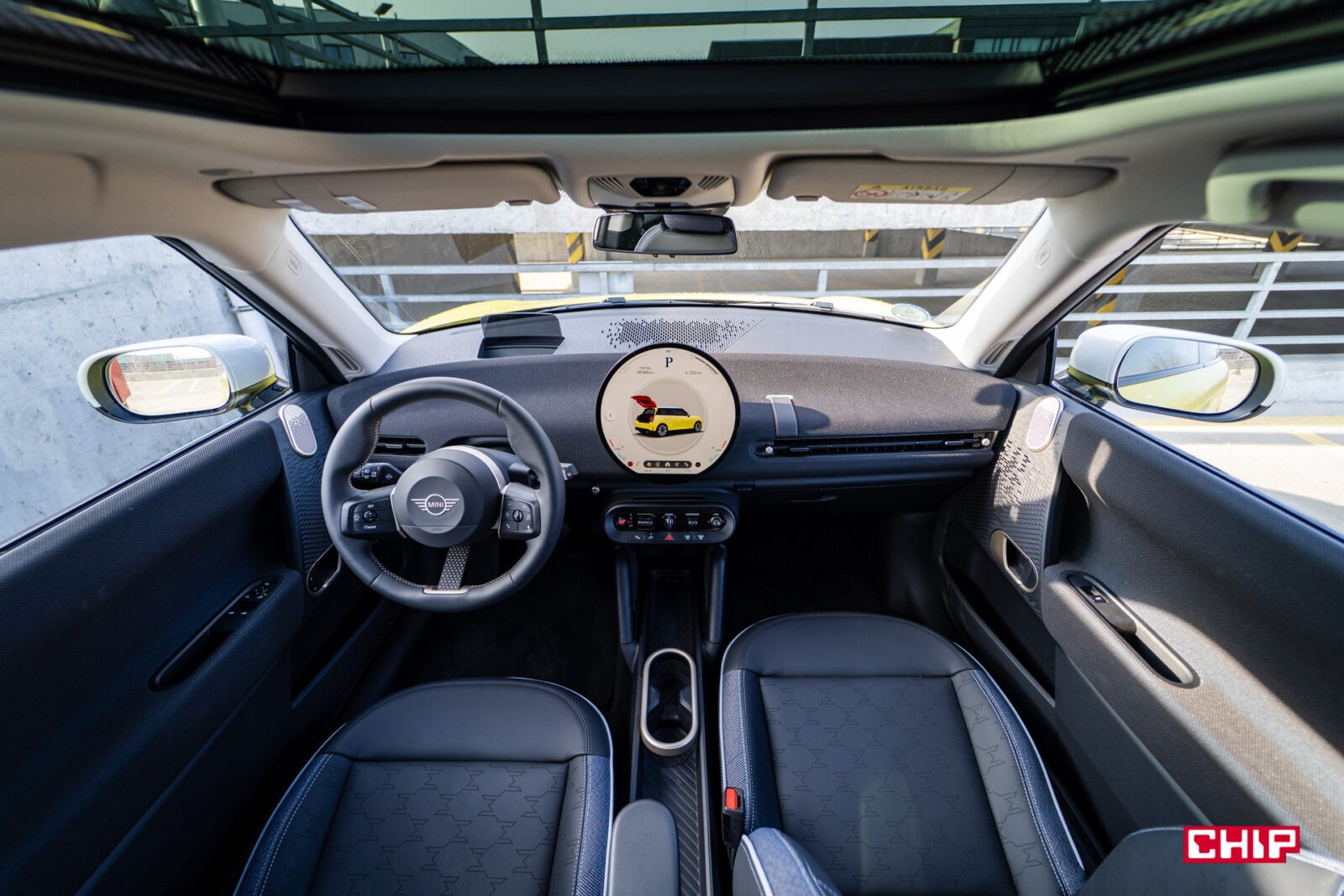 MINI Cooper łączy w sobie klasyczne DNA marki z nutą futurystycznej świeżości — to design, który nie wszystkim od razu sprzeda ten samochód, ale bez dwóch zdań przykuje uwagę i zrobi spore wrażenie. Przyciemniane tylne szyby i szklany dach panoramiczny, gdzie znajduje się dodatkowe podświetlenie, dodają luksusowego i jednocześnie ekscentrycznego akcentu. Sam z nowymi MINI mam taki dylemat, że chociaż raczej nie kupuje mnie ta stylistyka na tyle, żebym sam rozważał zakup takiego samochodu, to trudno jej zwyczajnie nie docenić i za każdym razem, kiedy po dłuższej przerwie wsiadam do jakiegokolwiek modelu z nowej linii (Aceman również przypadł mi do gustu, nawet nieco bardziej przez większe gabaryty) to jestem zwyczajnie oczarowany. Gdyż właśnie, to, co dzieje się w środku, robi chyba nawet jeszcze większe wrażenie.
