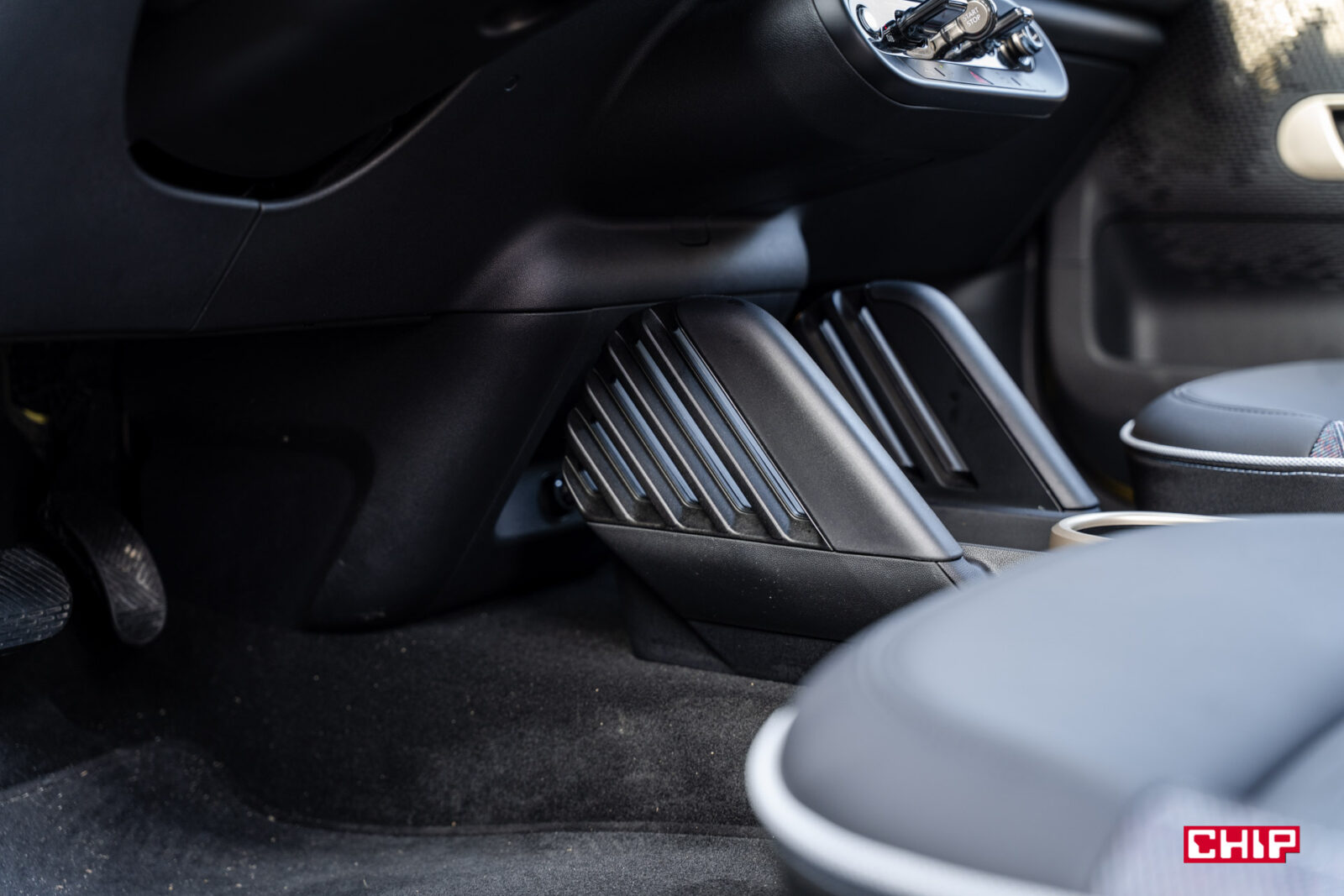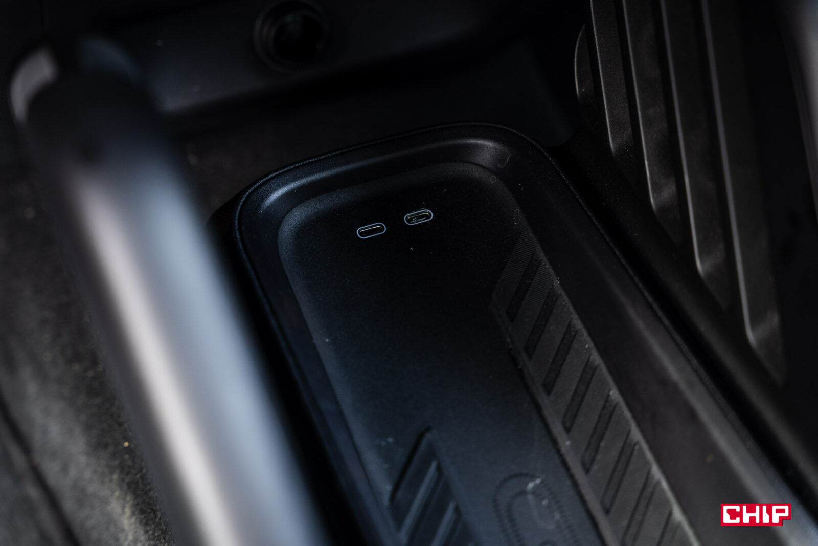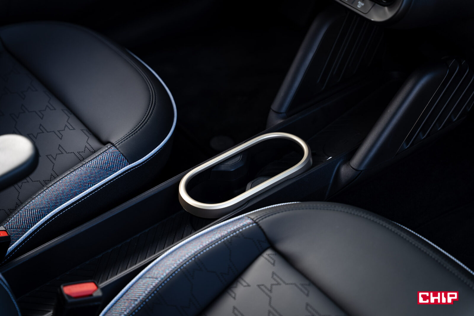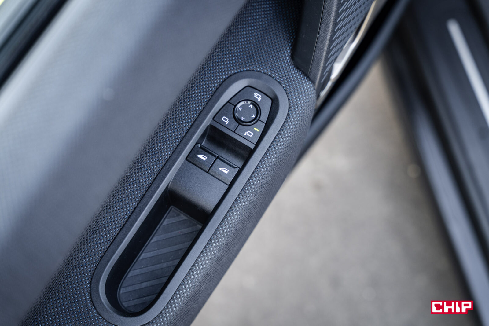 Jeszcze niżej znajdziemy dwa porty USB-C, wygodną półkę na smartfon, dwa uchwyty na kubki i podłokietnik zintegrowany z fotelem kierowcy (czyli pasażer musi sam się martwić). Przed fotelem pasażera jest schowek, a w drzwiach dodatkowe kieszenie — niezbyt duże, ale wystarczające. Klamki wewnętrzne mają futurystyczny sznyt, co może zaskoczyć za pierwszym razem, ale to zdecydowanie zaleta. Kierownica — solidna, dobrze wyprofilowana — ma przyciski do tempomatu po lewej i multimediów po prawej. Fajnym akcentem są małe diody LED przy kierownicy, które migają na pomarańczowo (wraz z ekranem), gdy asystent jazdy prosi o przejęcie kontroli.