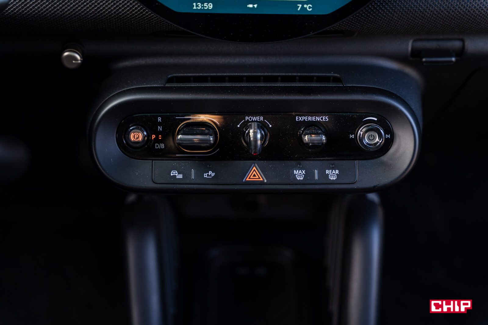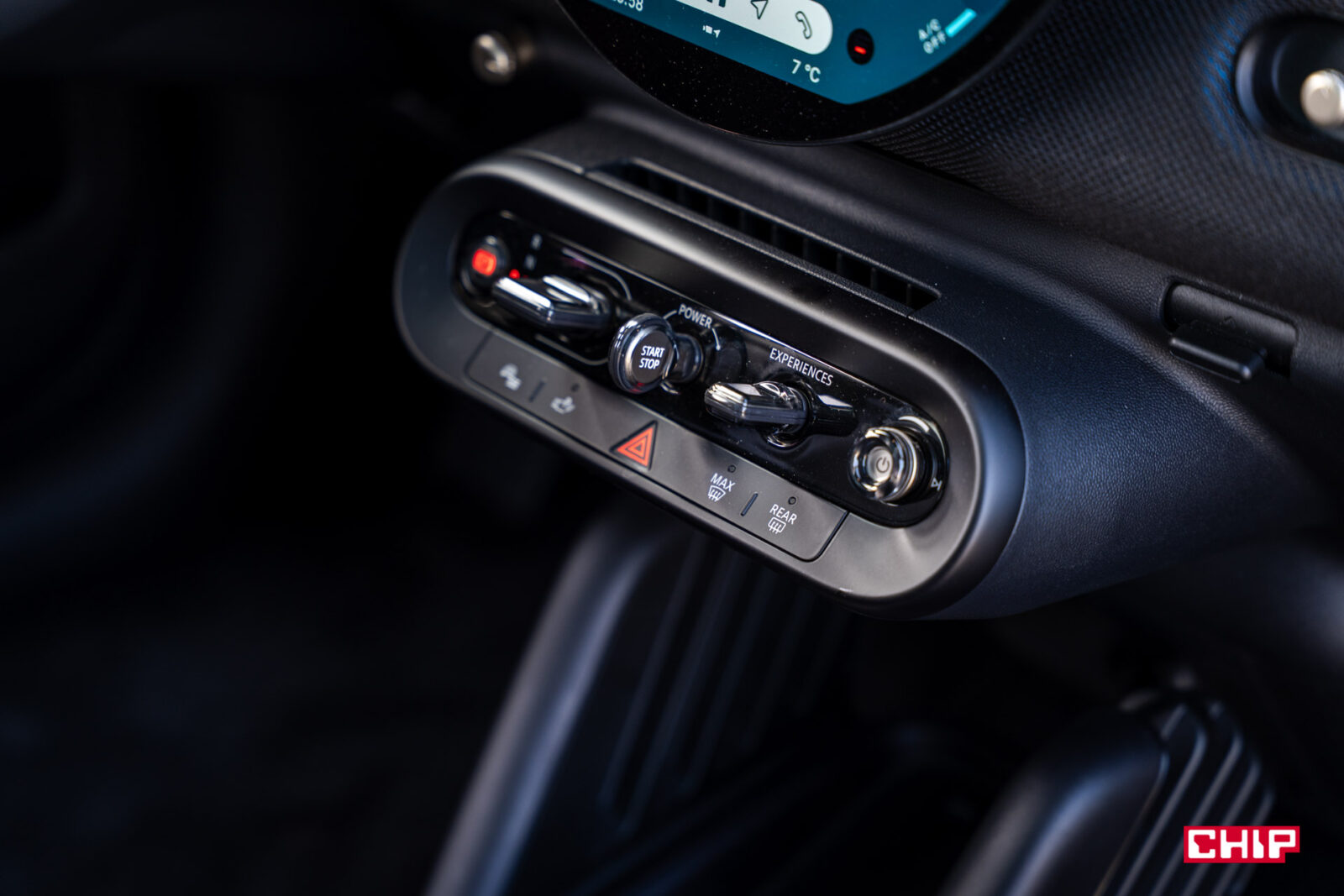 Pod okrągłym ekranem, który jest głównym centrum sterowania, czeka na nas powiew klasyki. Samochodu nie odpalamy tu banalnym przyciskiem — zamiast tego mamy przełącznik w stylu kluczyka wbudowany w konsolę, który trzeba przekręcić, by ożywić Coopera. Niecodzienne, ale naprawdę fajne! Z lewej strony znajdziemy przycisk hamulca ręcznego, obok panel dźwigienkowy do zmiany biegów, a dalej wspomniany „kluczyk”. Po prawej umieszczono przełącznik trybów jazdy, które tu są nazywane „doświadczeniami”, oraz pokrętło głośności z funkcją włączania/wyłączania systemu audio — i tu jedyne zastrzeżenie: dlaczego ikona włącznika obraca się wraz ze zmienianiem głośności? Niesamowicie gryzie mnie to estetycznie. Niżej znajduje się jeszcze mała seria już mniej efektownych przycisków, takich jak włączający asystenta parkowania, nawiew na przednią i tylną szybę czy włączający światła awaryjne. Te fizyczne elementy to ukłon w stronę tradycji, który przyjemnie kontrastuje z nowoczesnością.