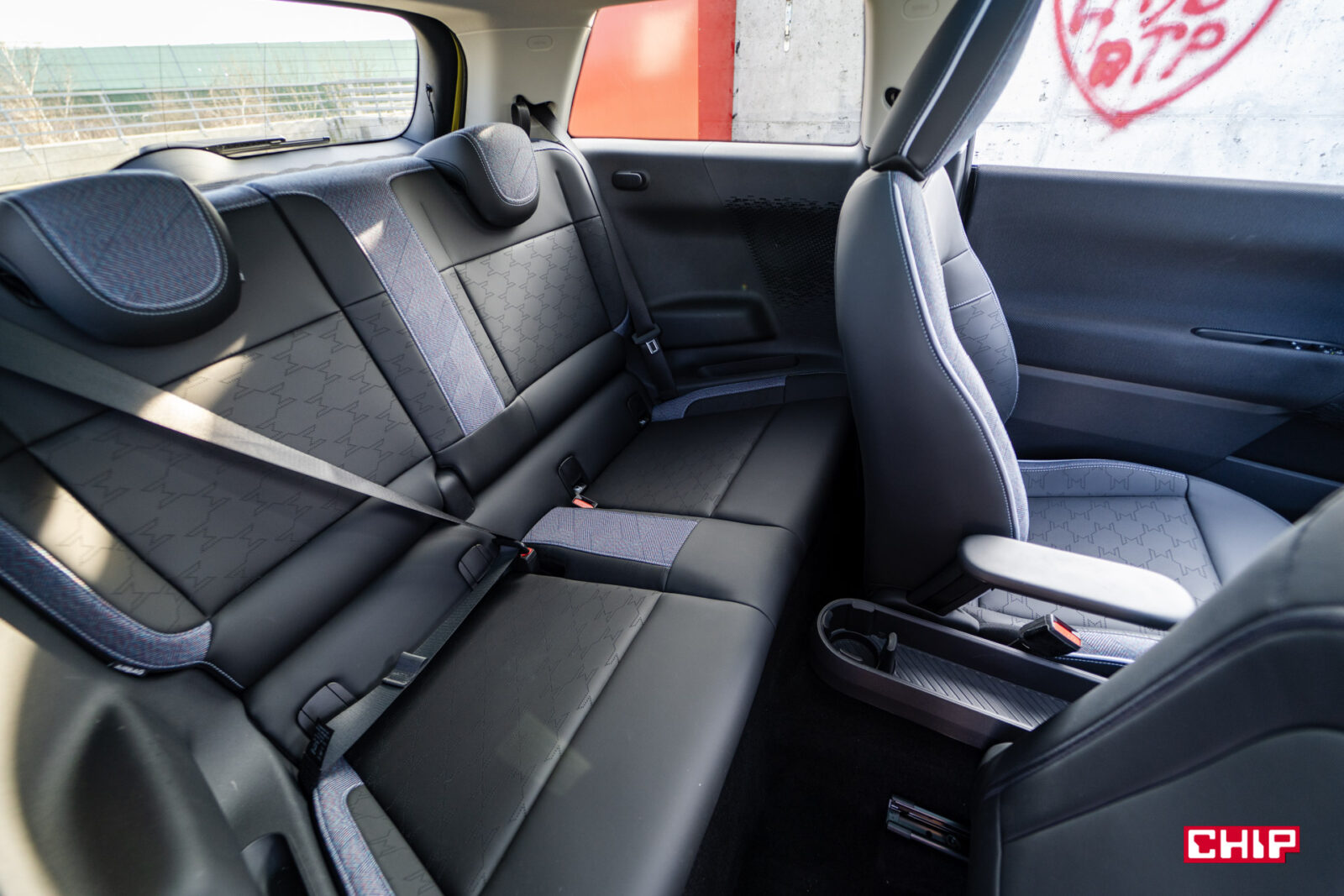 Cooper jest mniejszy od Acemana czy Countrymana… i to niestety mocno czuć. Z przodu jest komfortowo i wygodnie, ale problemy robią się w momencie, w którym chcemy wsiąść do samochodu w więcej niż dwie osoby. Projekt wnętrza nawet niezbyt udaje, że z tyłu ktoś jest przewidziany — wspomniana przegródka z cup holderami i portami ładowania ciągnie się przez całą długość samochodu i dosłownie na grubość palca nie łączy się z tylnymi siedzeniami. Na samym końcu, o dziwo, znalazło się miejsce na jeszcze jeden cup holder. Ja ze wzrostem 186 cm nie próbowałem nawet wchodzić do tyłu, za to nieco niższemu Arkowi udało się tam wturlać na czas robienia zdjęć — za to przedni fotel był wtedy przesunięty maksymalnie do przodu, a i tak cały proces nie należał do jakkolwiek wygodnych.